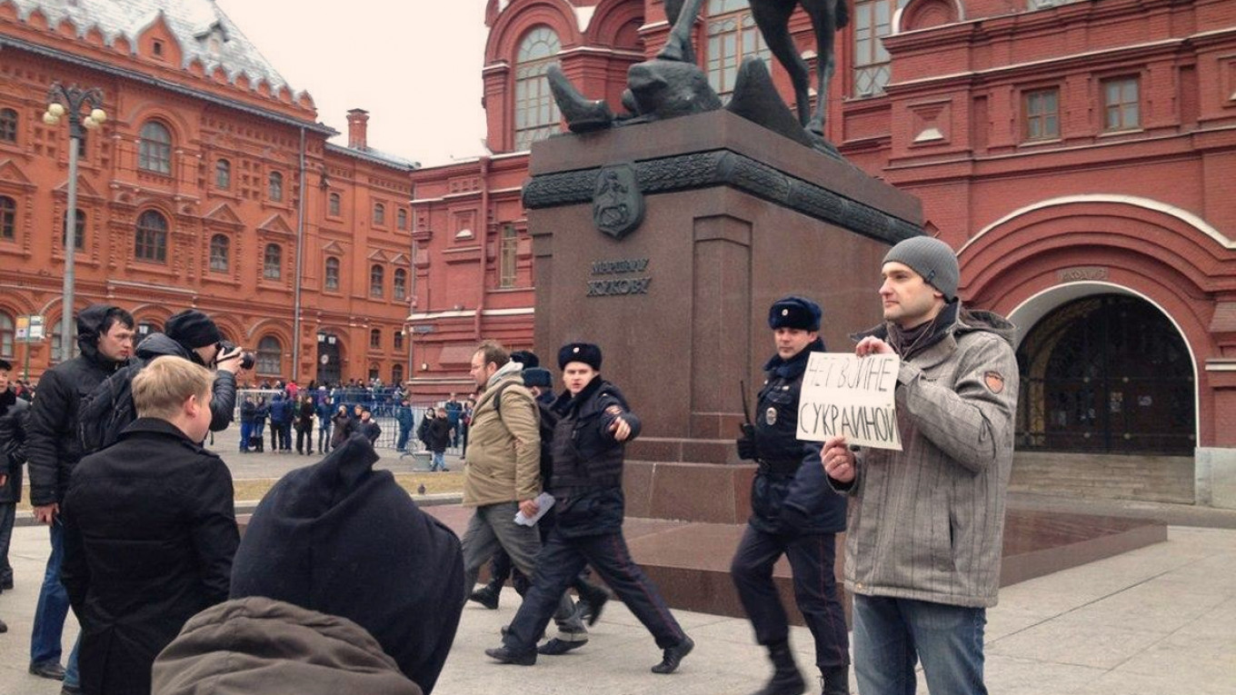 2 марта, на следующий день после решения Совета Федерации на Манежную площадь в Москве спонтанно стеклись российские граждане – те, кто протестовал против военных действий. К 14.30 их там собралось около 300 человек. Сначала люди стояли молча и держали самодельные плакаты — «Нет войне» и «Нет интервенции в Крым». Кто-то из протестующих держал бумажных белых голубей. Через полчаса, в районе 15 часов, приехала полиция. Молчавшие до того протестующие стали скандировать «Нет войне». Первыми полиция стала задерживать тех, кто выкрикивал лозунги. Вторыми — тех, кто просто стоял неподалеку. К 16 часам полиция оттеснила протестующих к гостинице «Москва», где задержания продолжились.