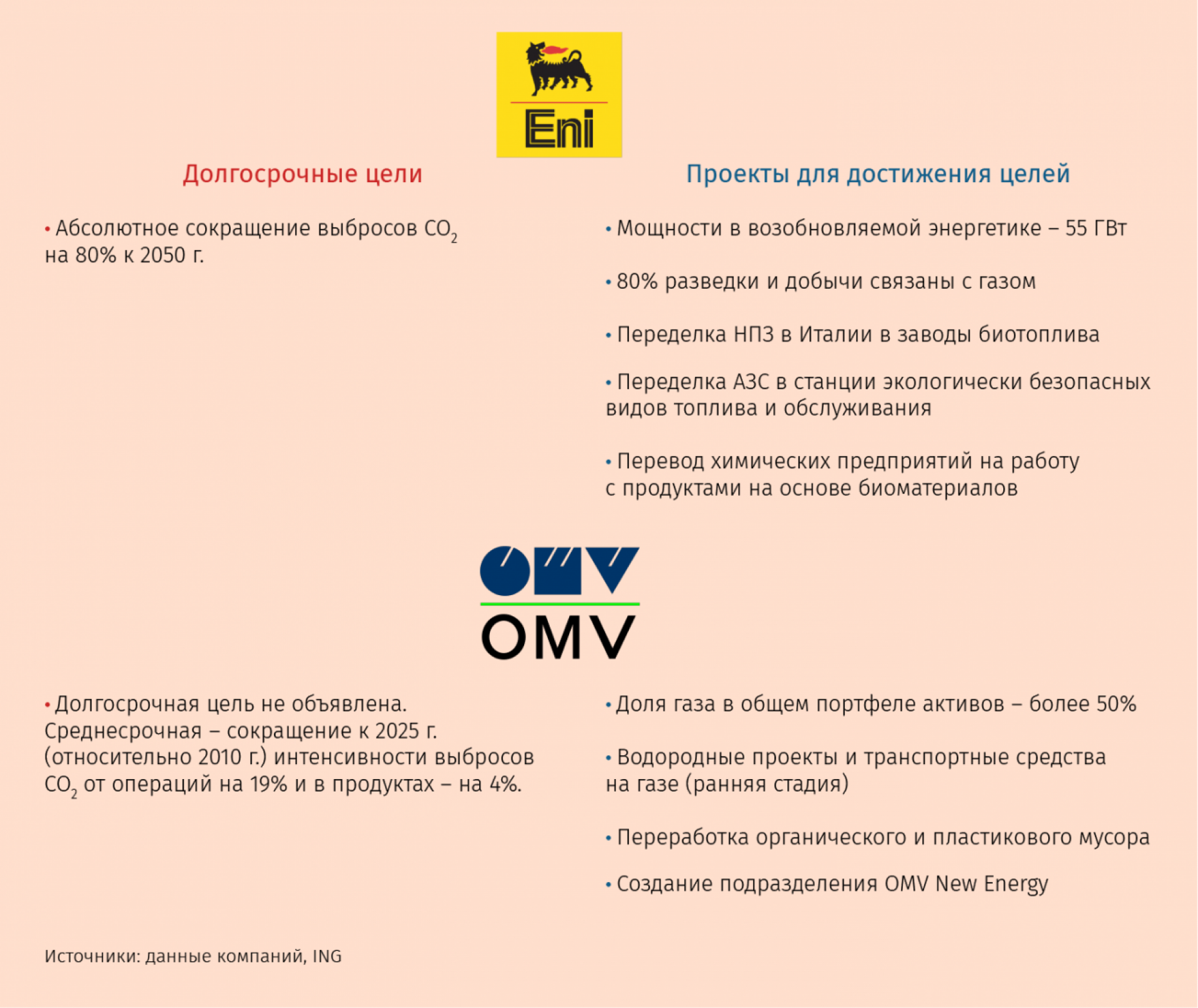 Объявленные перемены затрагивают всю цепочку создания стоимости, отмечают аналитики ING. Они включают собственные действия компаний (от ограничения выбросов метана при испытании скважин и сжигании попутного газа до мер, компенсирующих вредные выбросы, таких как хранение углекислого газа, производство биопродукции и посадка деревьев) и операции других участников (улавливание выбросов на газовых электростанциях, производство более экологичного транспорта и т. д.). Ряд компаний, включая Total, Shell, Repsol, Eni, выходят в такие секторы, как производство электричества, дистрибуция его и газа, станции подзарядки и проч.