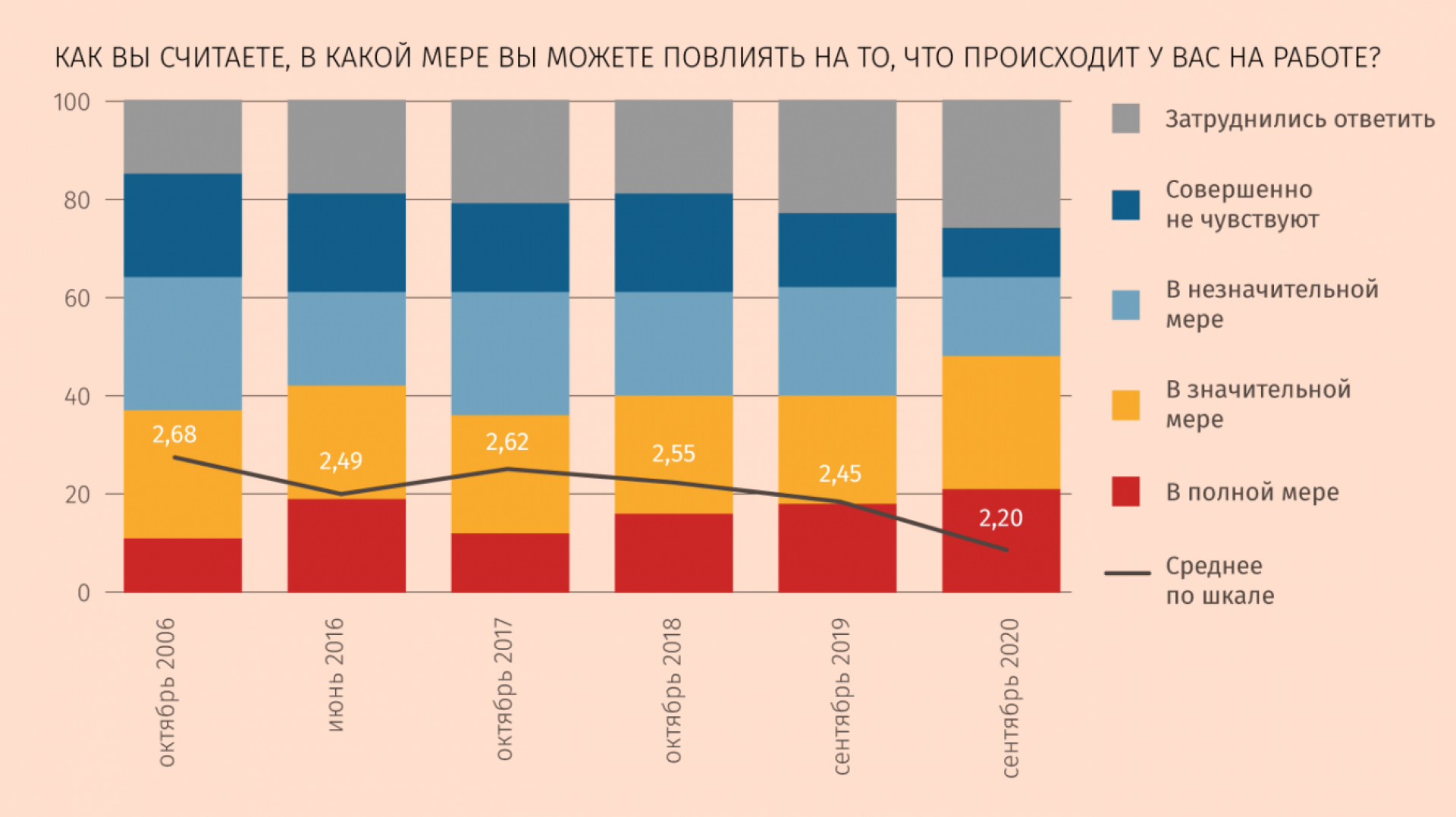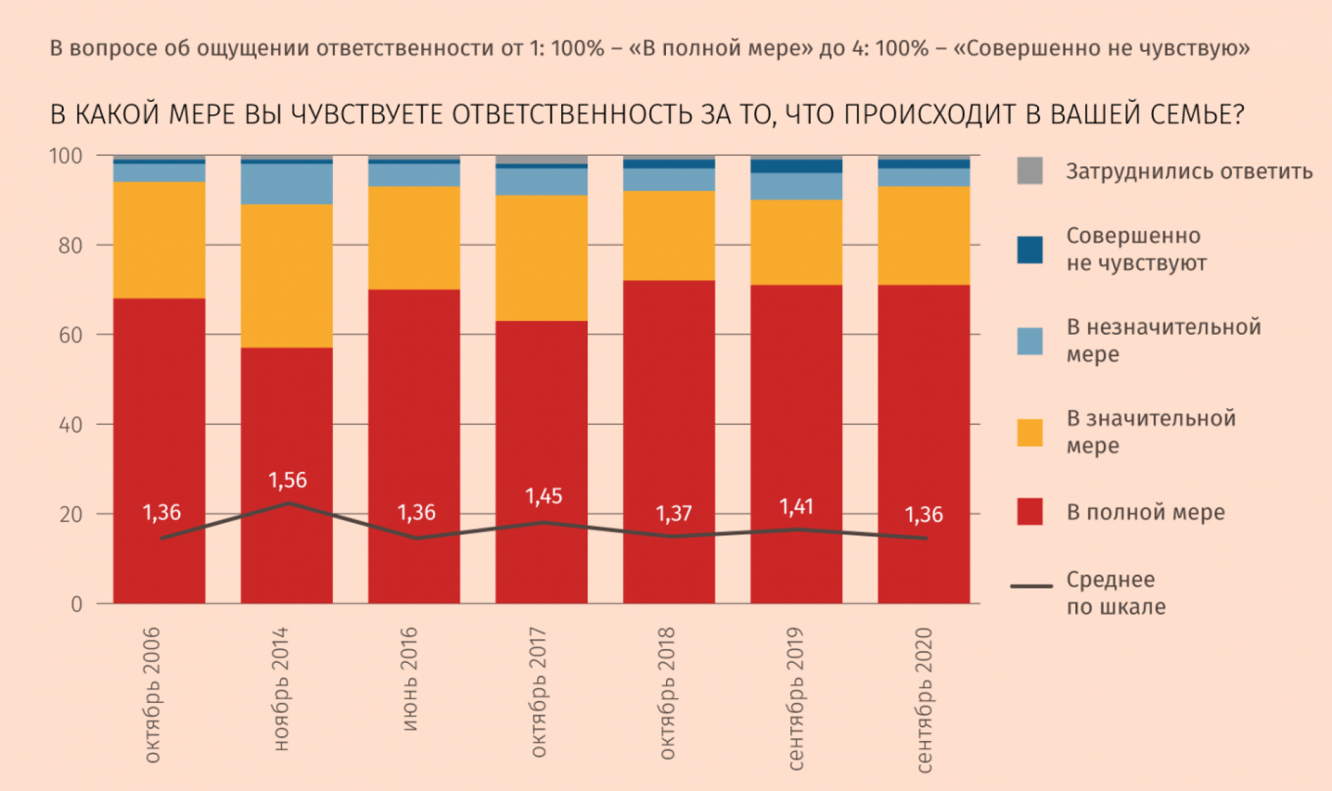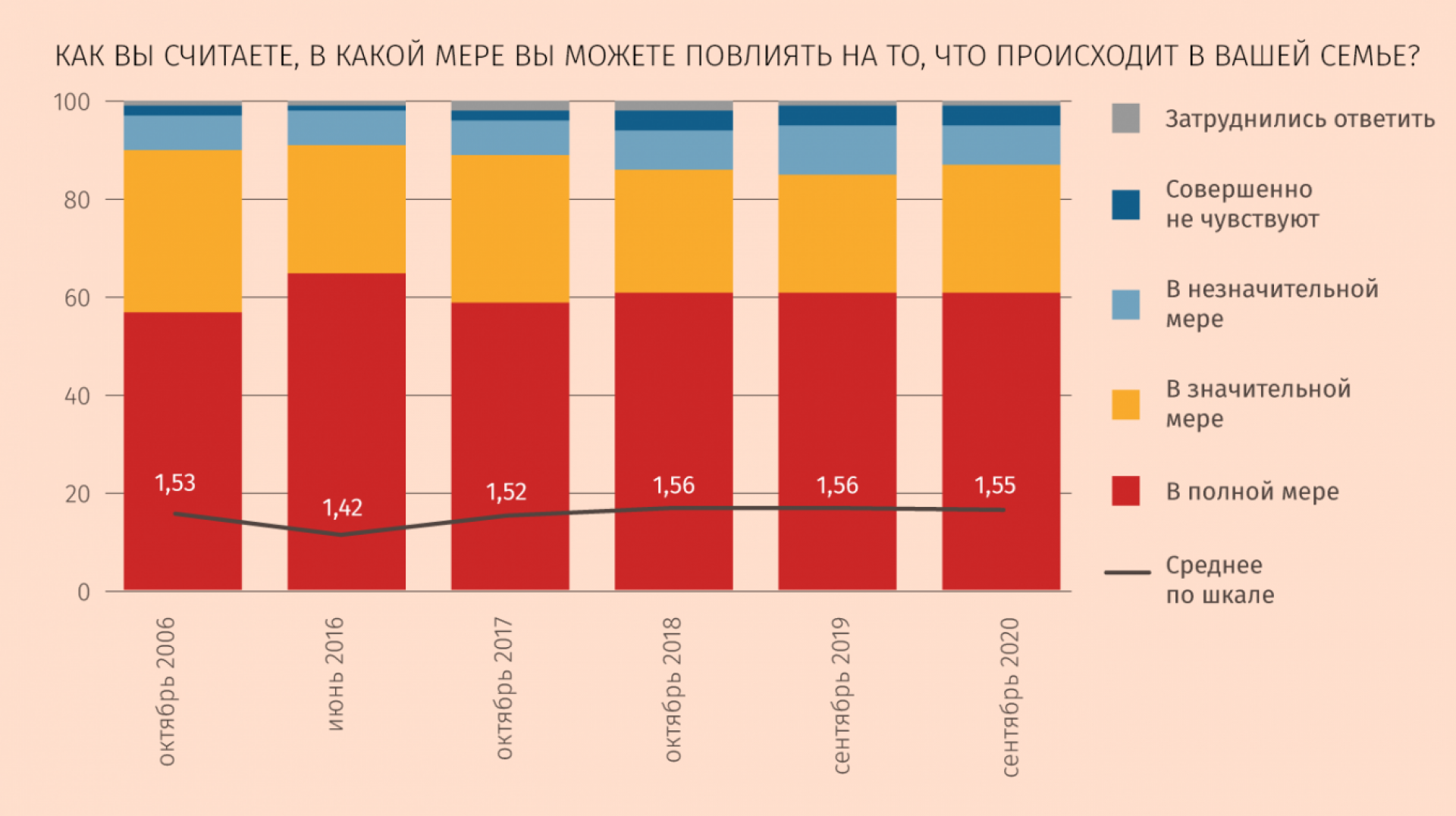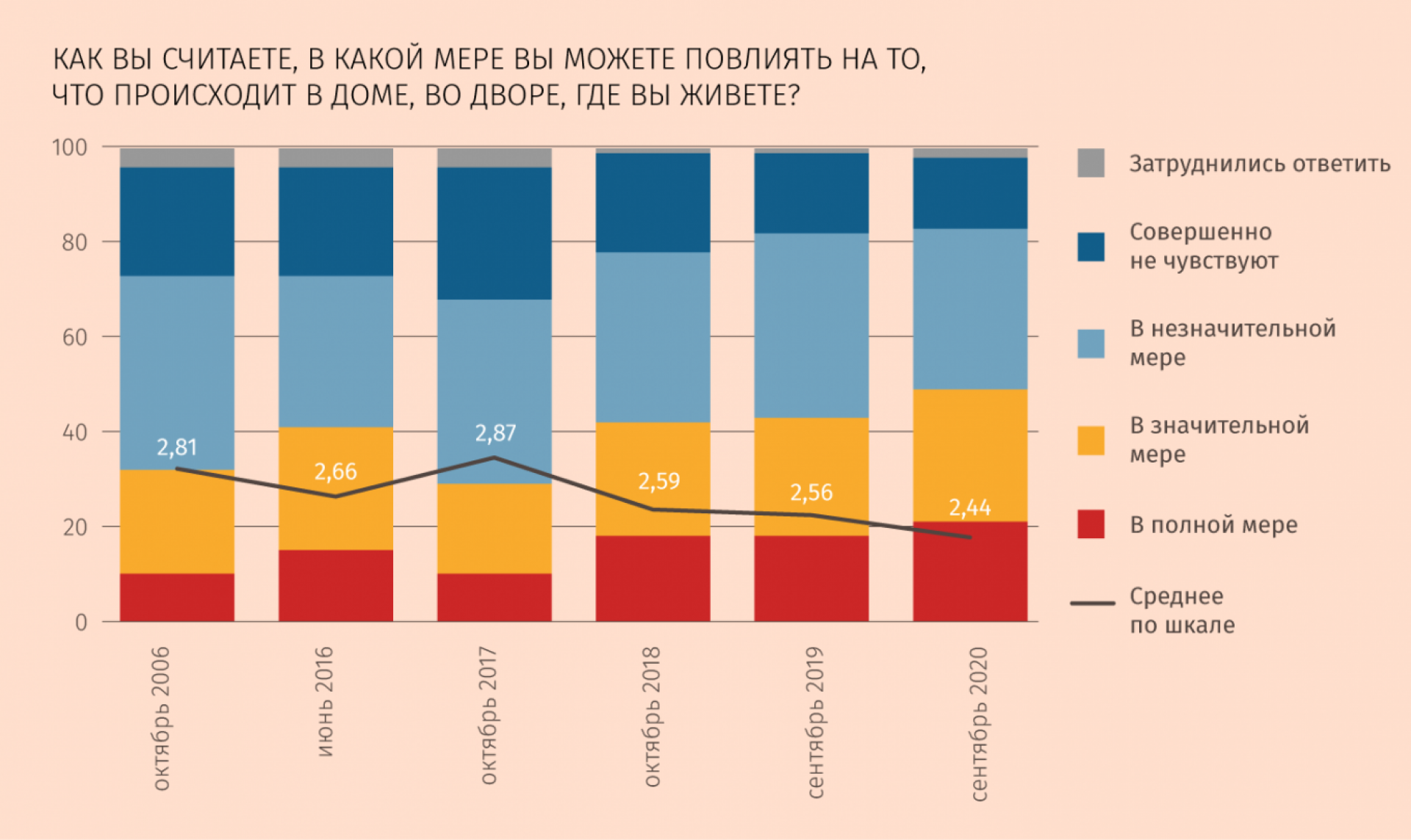 Последние пятнадцать лет «Левада-центр» спрашивает у жителей России, в какой мере они чувствуют ответственность за происходящее в разных сферах их жизни. В сентябре 2020 года подавляющее число россиян чувствовали ответственность только за свою семью (93%), еще чуть более половины опрошенных – за свой дом, двор (61%) и происходящее на работе (56%), и этот топ-3 не меняется годами. Аналогичную картину мы видим по результатам вопросов о возможности повлиять на одну из этих сфер.