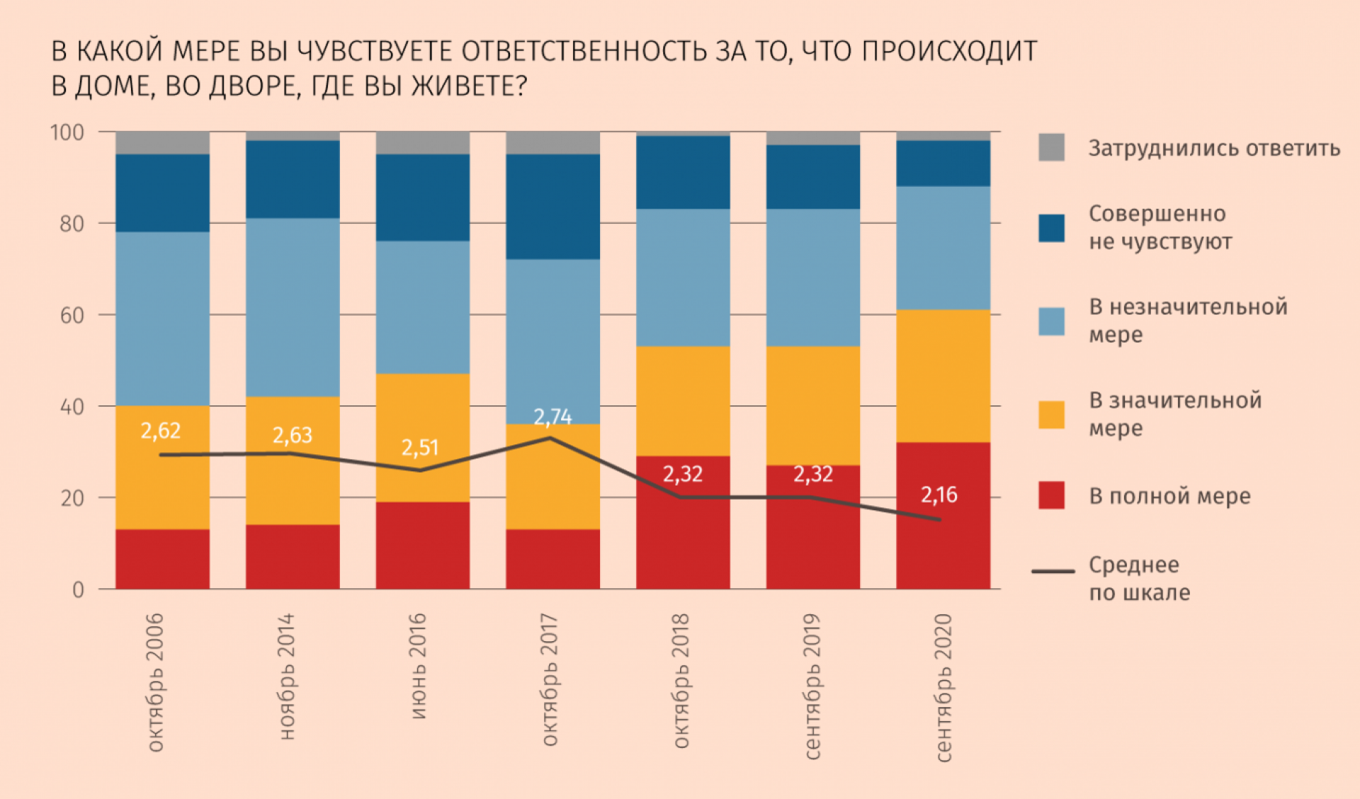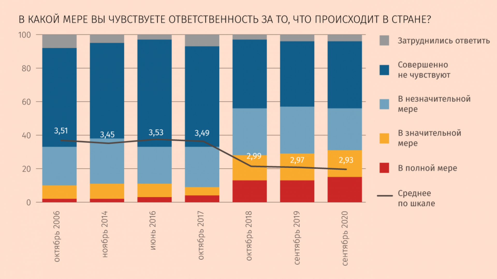 Даже в конце 2014 г., в период «посткрымской эйфории», аномально улучшившей практически все базовые индикаторы общественных настроений, только 11% россиян чувствовали ответственность за свою страну, в то время как 57% выбирали радикальную позицию «совершенно не чувствую» (если с ними суммировать тех, кто чувствовал лишь «в незначительной мере», то получится 84%). Стоит ли напоминать, что рейтинги основных институтов власти тогда достигали запредельных значений, и эта развилка в общественном мнении, возможно, лучший показатель отделения «личного» от «государственного».