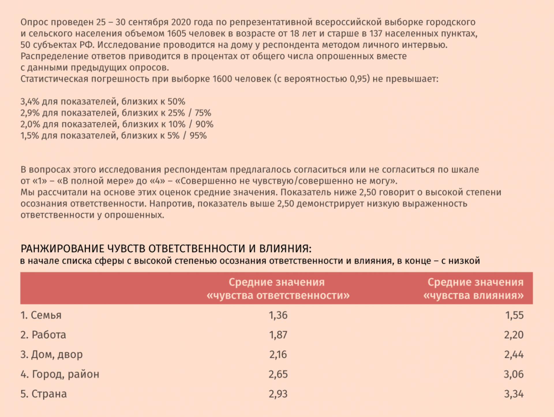 Касательно ответственности за то, что происходит в городе, районе или в стране, доминирующие мнения находились на противоположном полюсе: менее половины респондентов готовы отвечать за свой город, район (41%), еще меньшая доля – за страну (31%).
