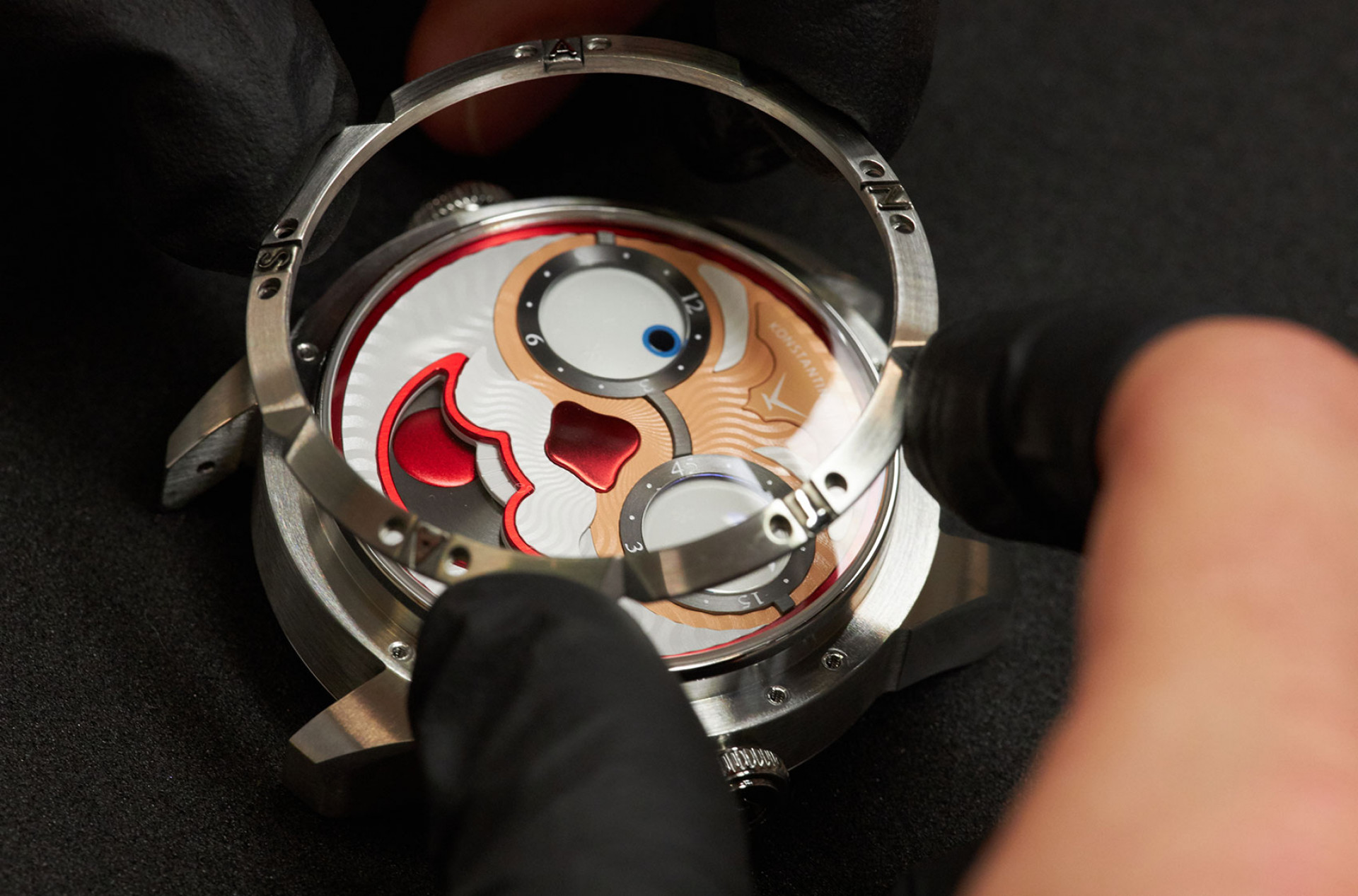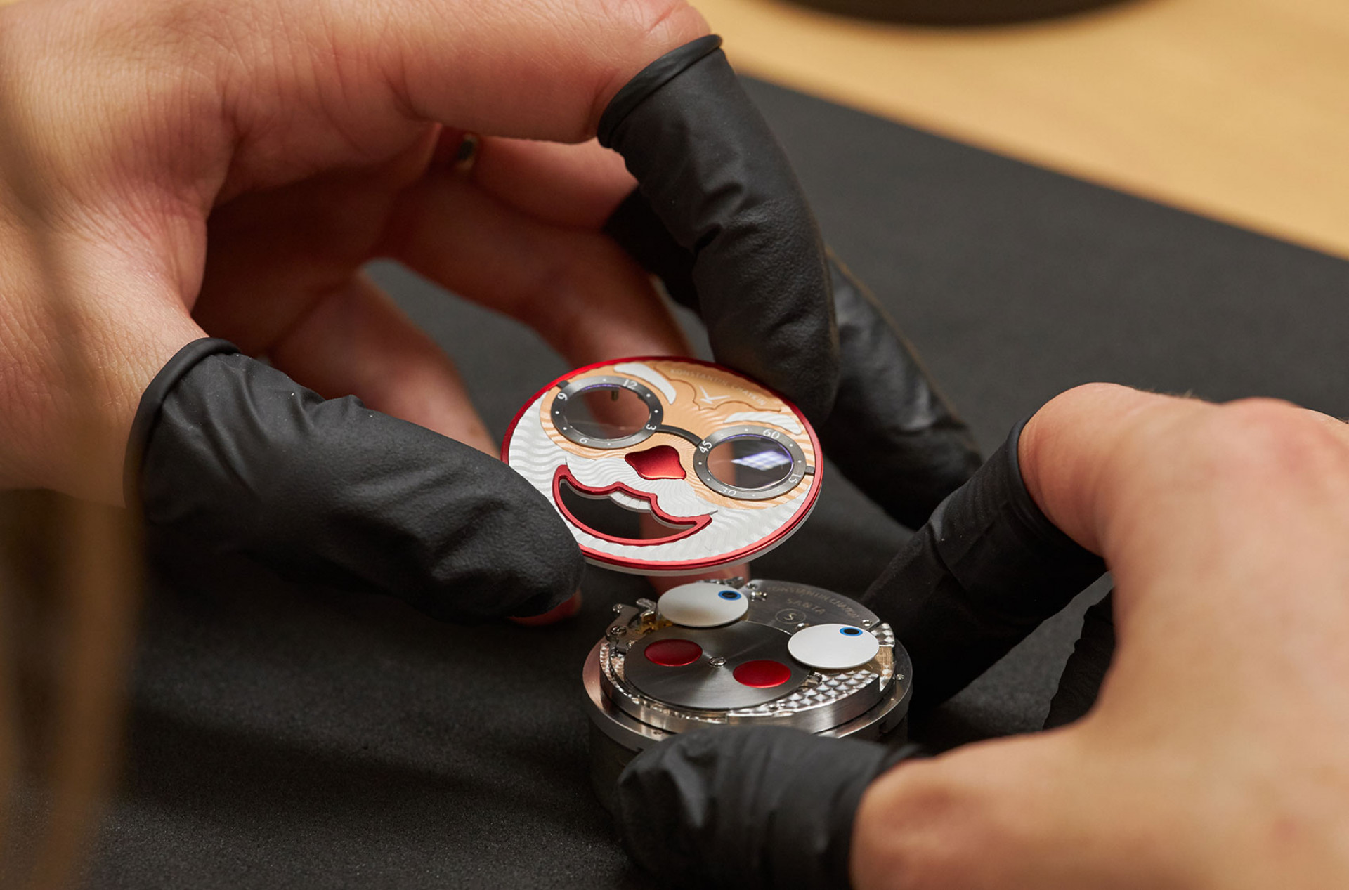 Несмотря на то что часы внешне схожи, даже незначительные изменения дизайна усложняют механизм, рассказывает Чайкин. Из-за очков увеличилось число деталей циферблата «Санты» и его толщина. Потребовалось дополнительное пространство внутри корпуса, но делать корпус более толстым не хотелось. Поэтому Чайкин модифицировал фирменный модуль джокер-индикации. Если в механизме стандартной конструкции (Калибр K.07-0) выпуклые диски указателей часов и минут установлены выше диска указателя фазы Луны, то в новом Калибре K.07-2 все три диска оказываются в одной плоскости. Чайкин использовал более короткие оси дисков указателей часов и минут, а также увеличил радиус сферы (эти диски всегда имеют сферическую поверхность). Глаза немного уменьшились — визуально это компенсируется наличием сапфировых линз.