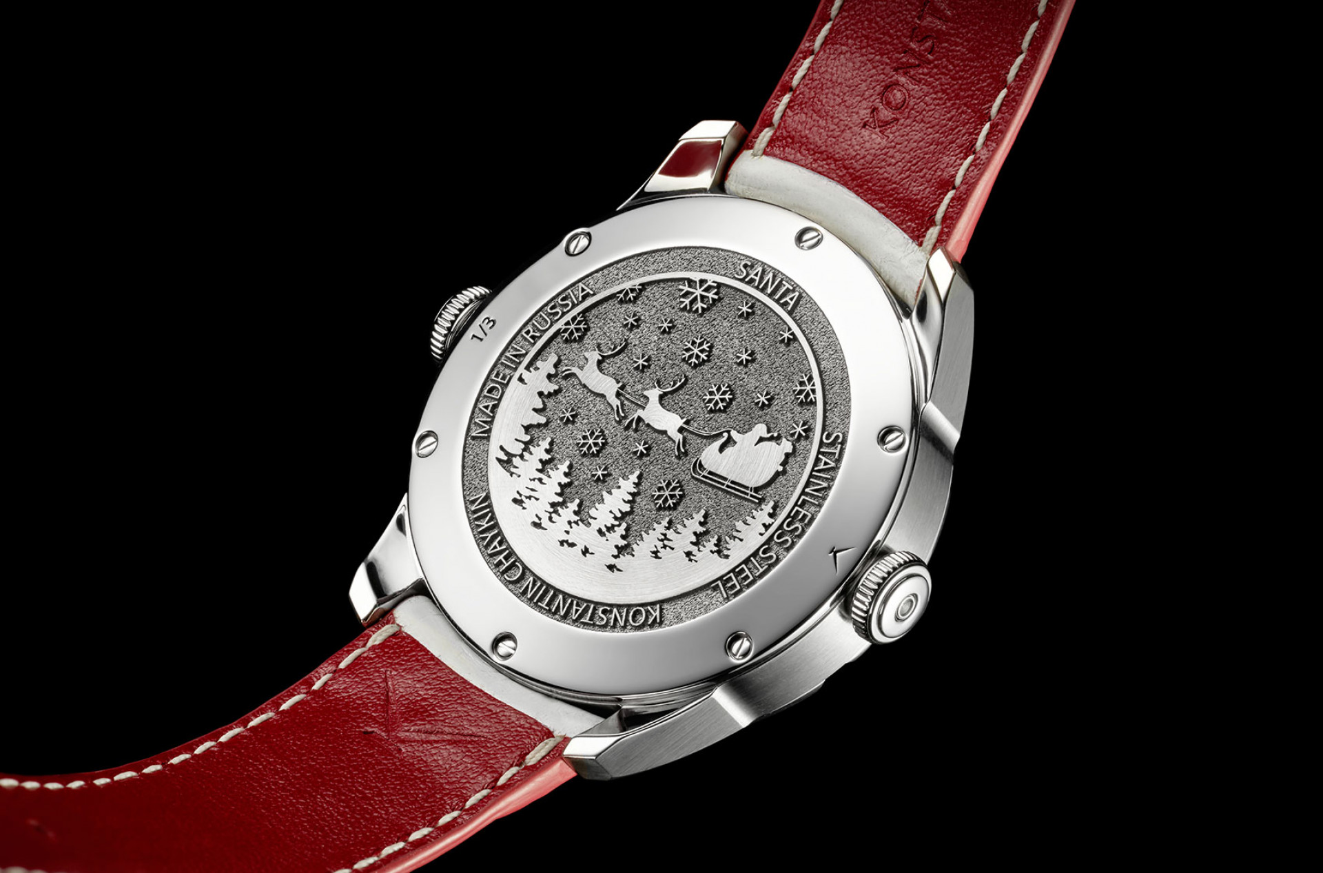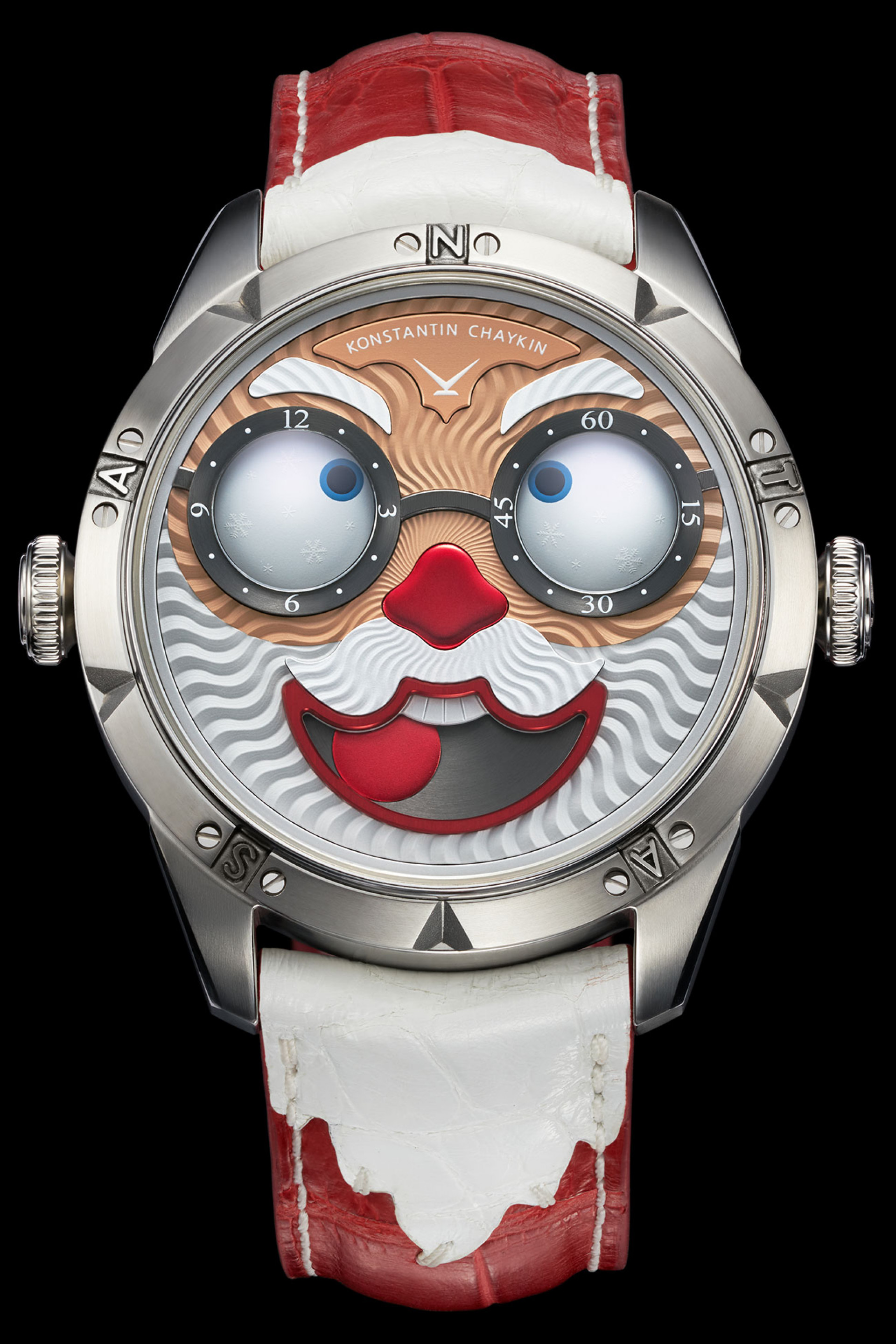 Часовая мануфактура Konstantin Chaykin представила первые в мире наручные часы с Санта-Клаусом Santa 2021 Special Edition. Циферблат и ремешок красно-белого цвета повторяют узнаваемое изображение: очки, борода, седые брови.