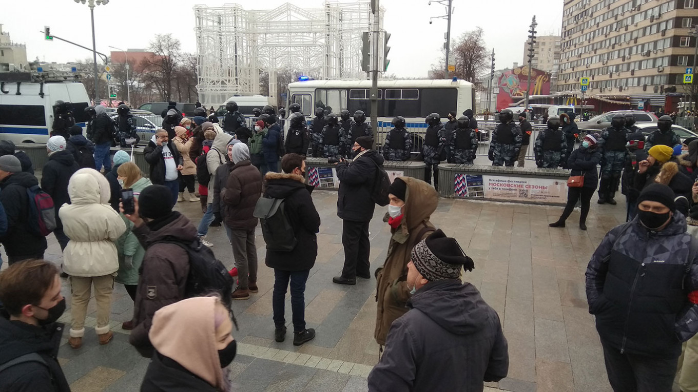 В центре Москвы, где сторонники Алексея Навального собрались провести митинг, начались задержания. Сотрудники полиции примерно раз в минуту выборочно задерживают людей из толпы, сообщает корреспондент VTimes.