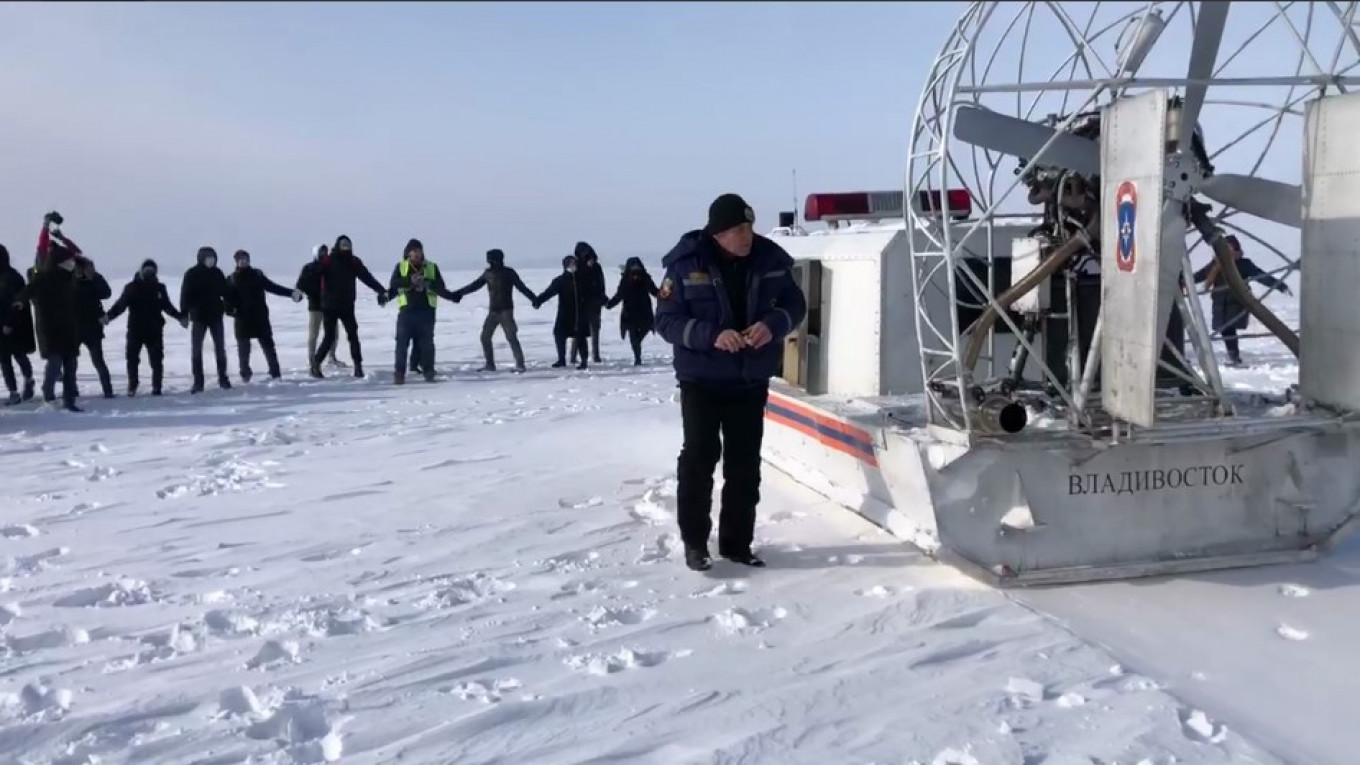 Протестующие начали водить хоровод вокруг заглохшего аэробота «Тайфун 1000К» и капитана полиции. На берегу их ожидали сотрудники ОМОНа — изначально они отказывались идти на лед из-за тяжелого обмундирования, но затем все же двинулись и оттеснили протестующих. По данным VladNews, на несогласованную акцию собрались около 150 человек.