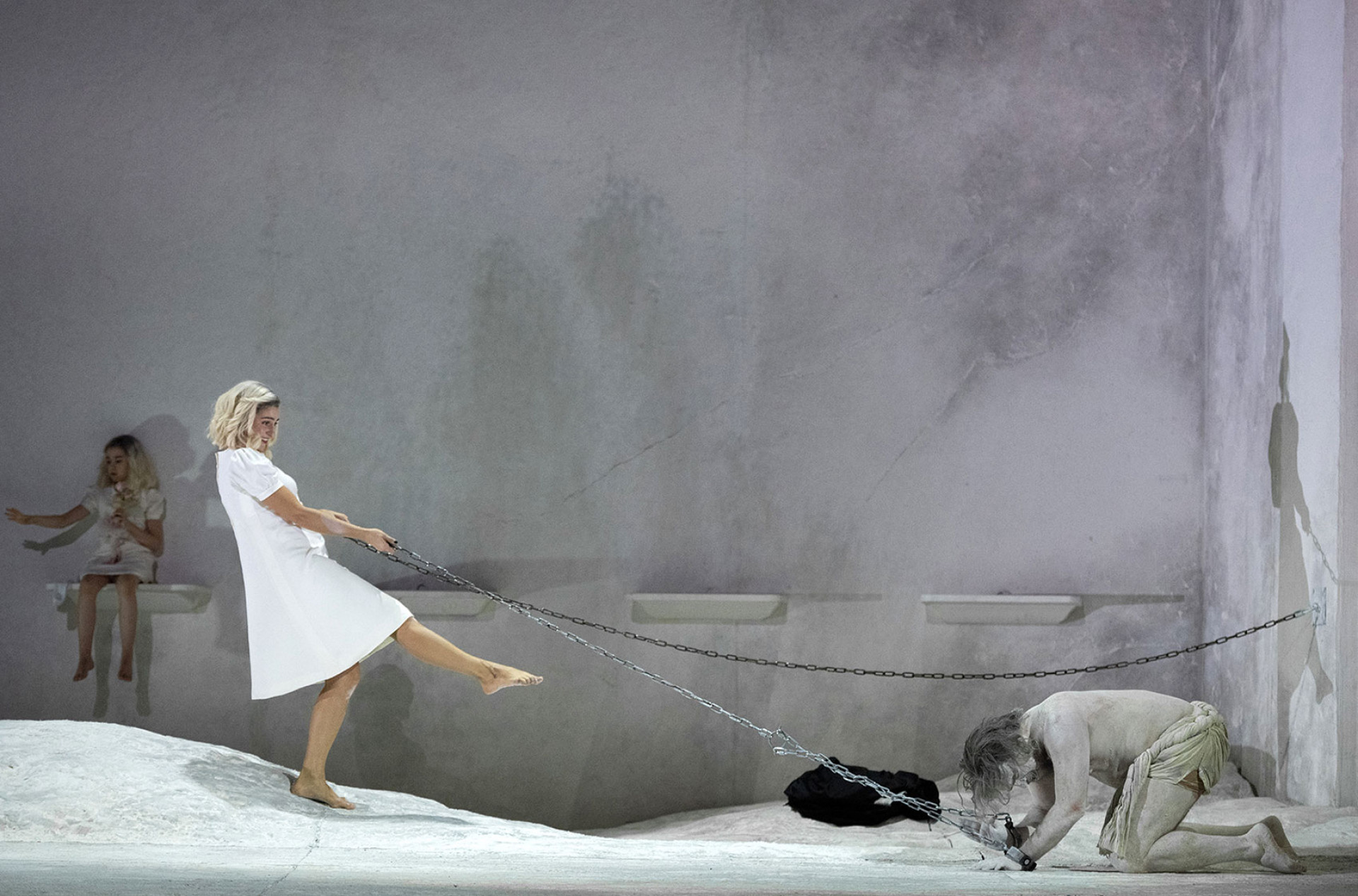 Что касается самой Саломеи, то стоит вспомнить фильм Пьера Паоло Пазолини «Евангелие от Матфея», где царевна выведена маленькой девочкой, исполняющей невинный танец. Тогда, в 1964 г., это оказалось свежо в немалой степени потому, что контрастировало с привычной эстетикой оперной «Саломеи», где заглавную партию обычно исполняла корпулентная певица с мощным голосом и чувственными обертонами. Проблема любого режиссера — решение эпизода с танцем: мало какая оперная артистка способна добавить к вокальной нагрузке еще и хореографический номер, даже если избавить ее от обязанности сбрасывать все семь покрывал. Клаус Гут эпизод с танцем профессионально решил — и даже оставил семь покрывал: только их по очереди снимают с каждой из семи Саломей разного возраста, а старшая из них выступает коллегой Гута — режиссером, представляющей Ироду в живых картинах всю историю ее детских унижений.