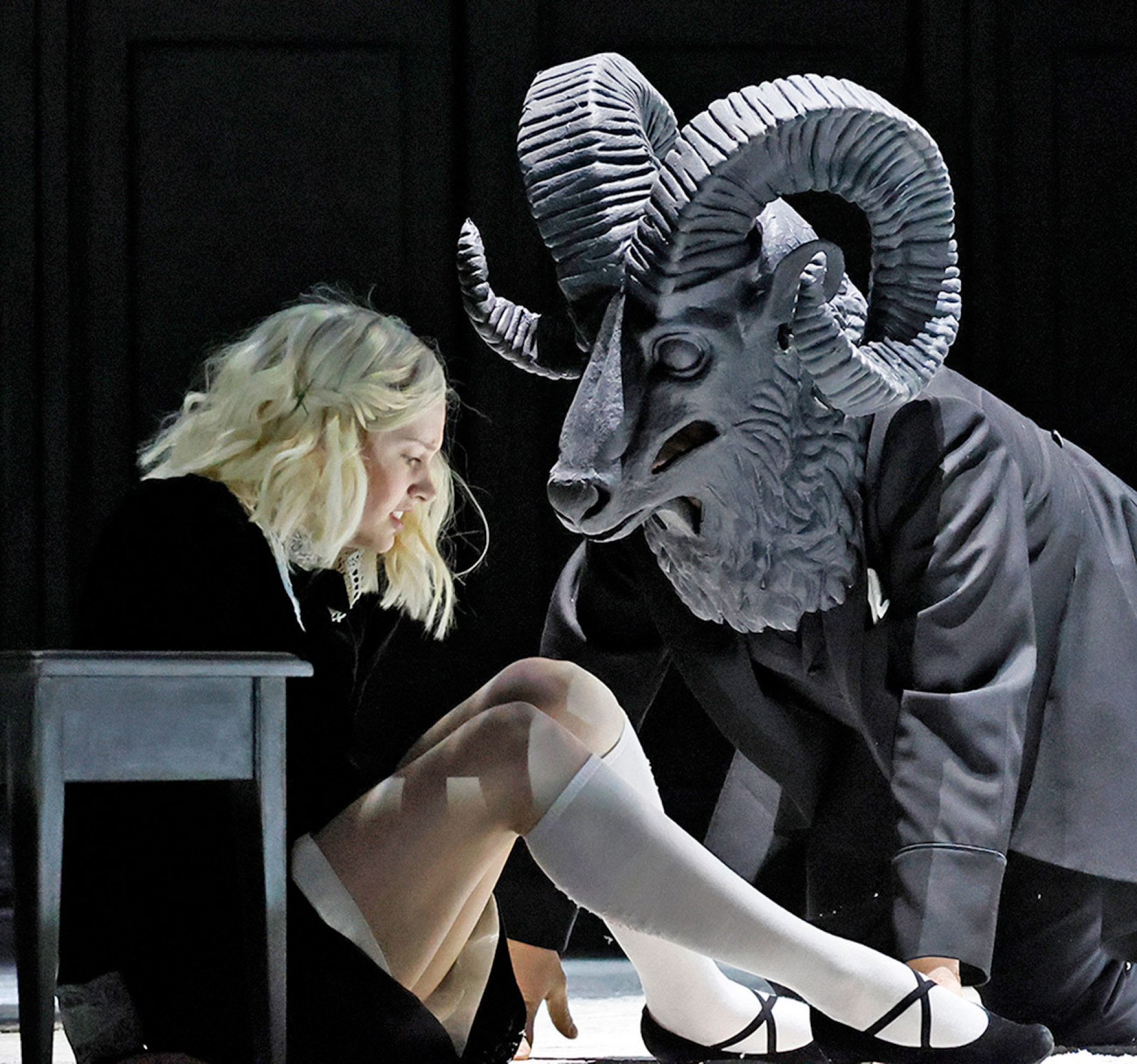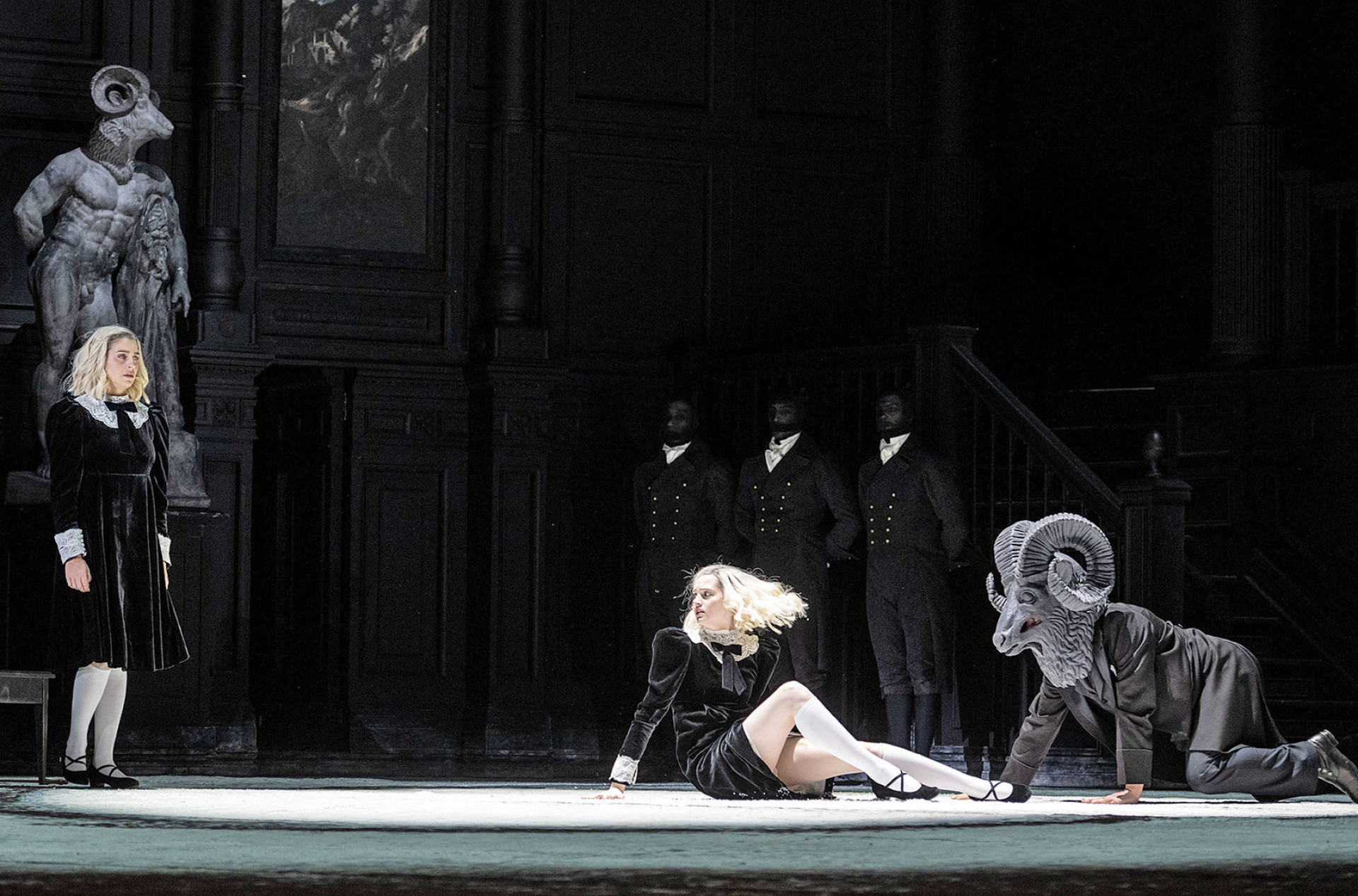 «Саломея» в Большом — гибрид американской зрелищности и современной европейской режиссуры. Как любой актуально мыслящий постановщик, Клаус Гут обязан привнести в историю, рассказанную композитором, некое «прибавление смысла». Сюжет про юную принцессу, потребовавшую у тетрарха Ирода в награду за танец голову Иоанна Крестителя (в опере он носит имя пророка Иоканаана), режиссер превращает в один из эпизодов взросления девочки, выросшей в семье похотливого отчима, пьющей матери и навидавшейся такого, из чего на сцене нам показывают лишь подобие черного ритуала статистов с козлиными головами (художник по костюмам — Урсула Кудрна). Действие перенесено в удушливый замок викторианской эпохи, из подвала которого доносятся проклятия пророка Иоканаана. Персонажи спускаются в подвал по диковинной лестнице, а мы съезжаем на лифте (все равно как из бельэтажа в гардероб) — и видим там чуть более аутентичную древность: по крайней мере, пророк полугол, вымазан известкой и сидит на цепи, а цвет стен и костюмов с черного меняется на белый, лишь кровь остается алой.