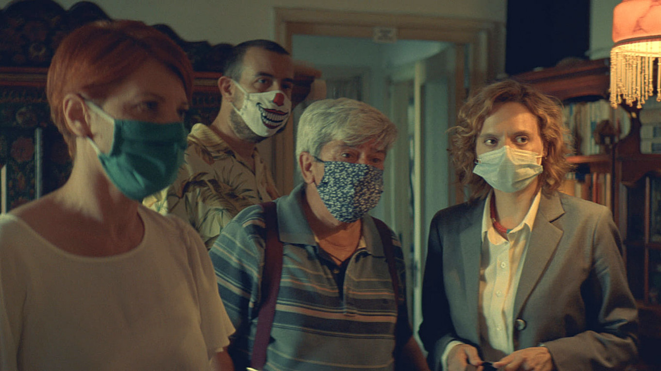 Если по порядку, то это прежде всего фильм первого года пандемии — когда люди обозлились и стали писать агрессивные комментарии в интернете. Персонажи носят маски, иногда смешные и нелепые, подчеркивающие их карнавальную природу. Любое утверждение от человека в маске выглядит комически. Пенсионеры спорят о теориях заговора в очереди в аптеку. В финале звучат заголовки статей и комментарии анонимных пользователей про «феминистский рейх».