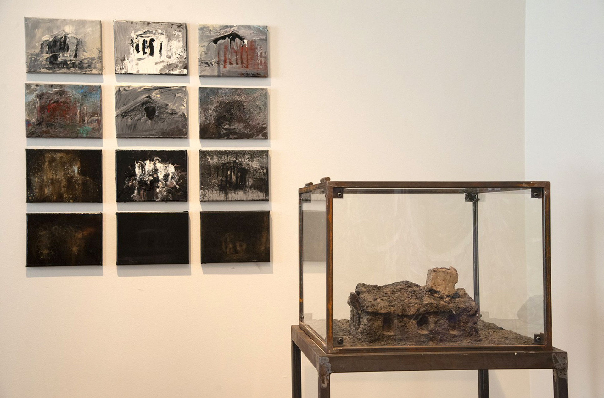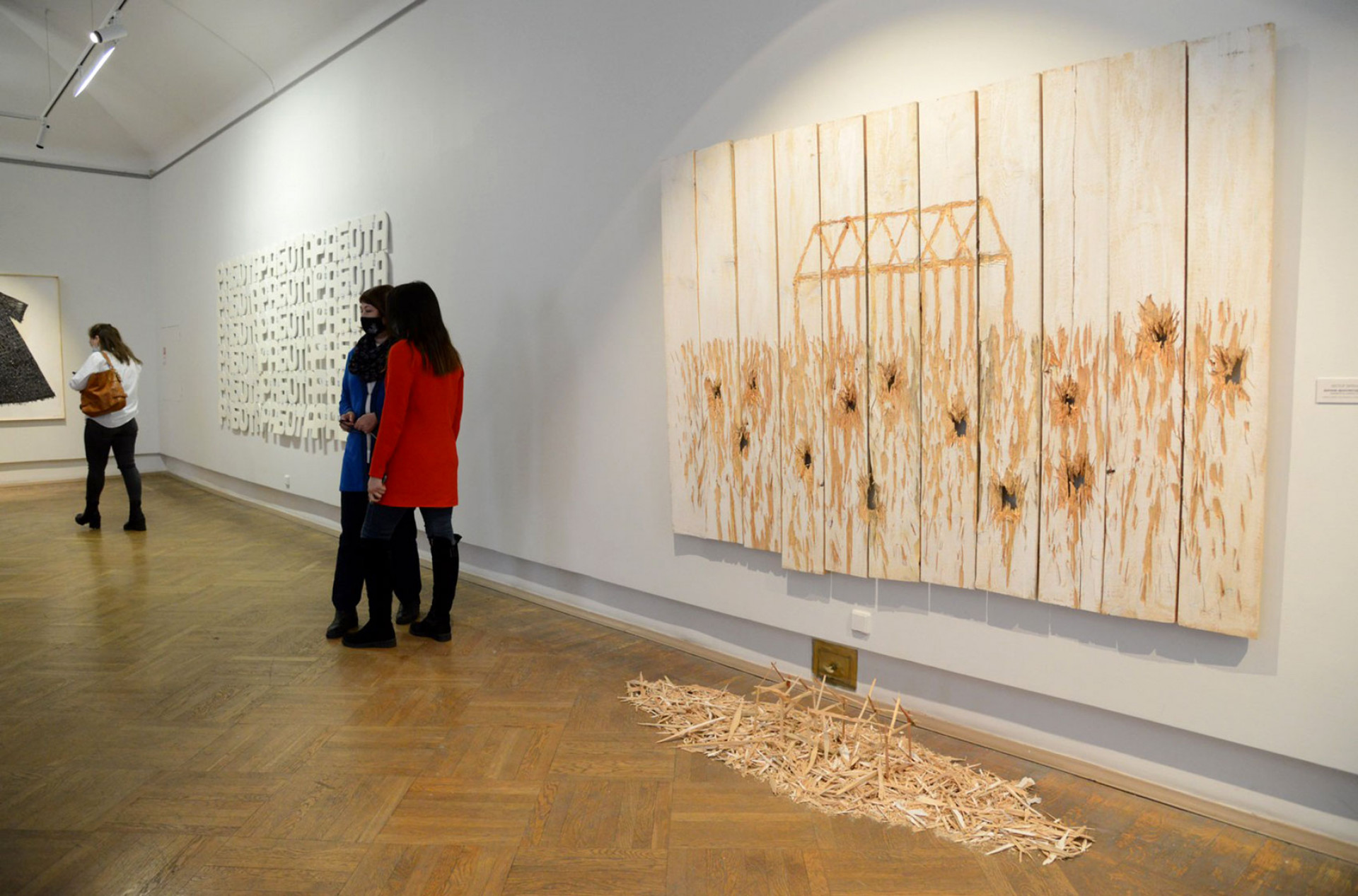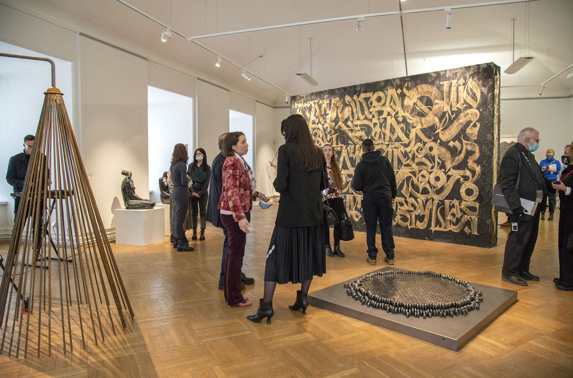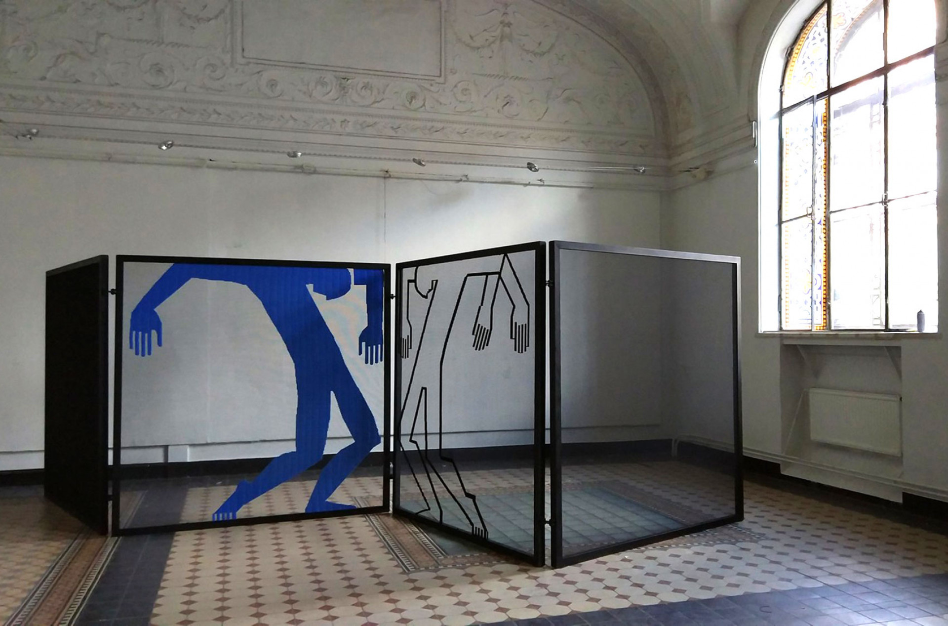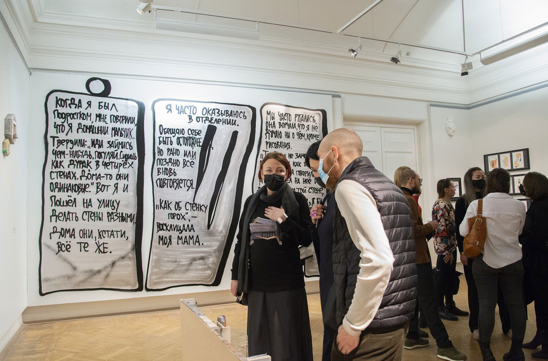 Стрит-артист Максим Има, чьи работы привычно видеть на заброшенных фасадах, был приглашен сделать граффити на стене последнего зала выставки — то, что на сленге уличных художников называется «кусок», — и отлично справился с задачей. Прямо в исторических интерьерах он написал по серебряному фону черным «Мои стенания» — пространный и поэтичный текст, где художник в очередной раз пытается объяснить себе, чем и зачем он этим занимается.