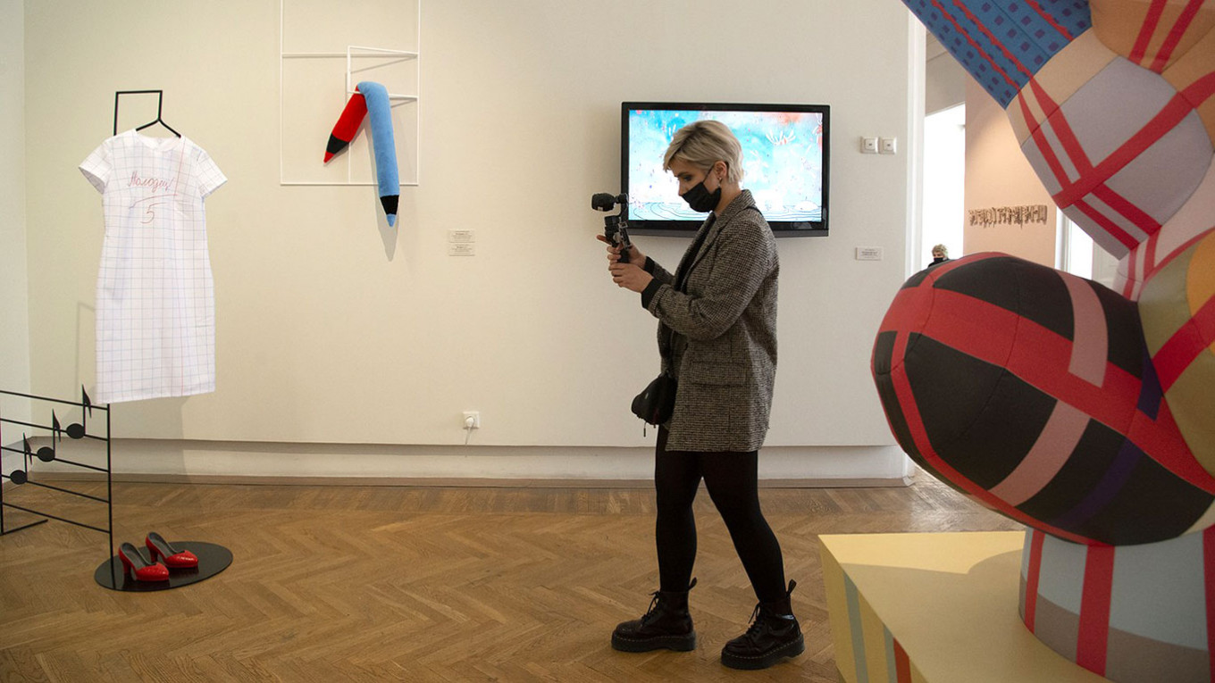 Во дворе Мраморного дворца сейчас заняла место огромная надувная скульптура — узнаваемые в ней мотивы дымковской игрушки вступили в живой диалог с монументом Александру III Паоло Трубецкого. Ее автор Максим Свищёв много лет работает с новыми медиа, создавая в виртуальной реальности объекты немыслимых расцветок, фактур и очертаний и помещая их в любое пространство. В последнее время он все чаще реализует свои идеи в материале, отчего получаются фантастические и брызжущие радостью существа.