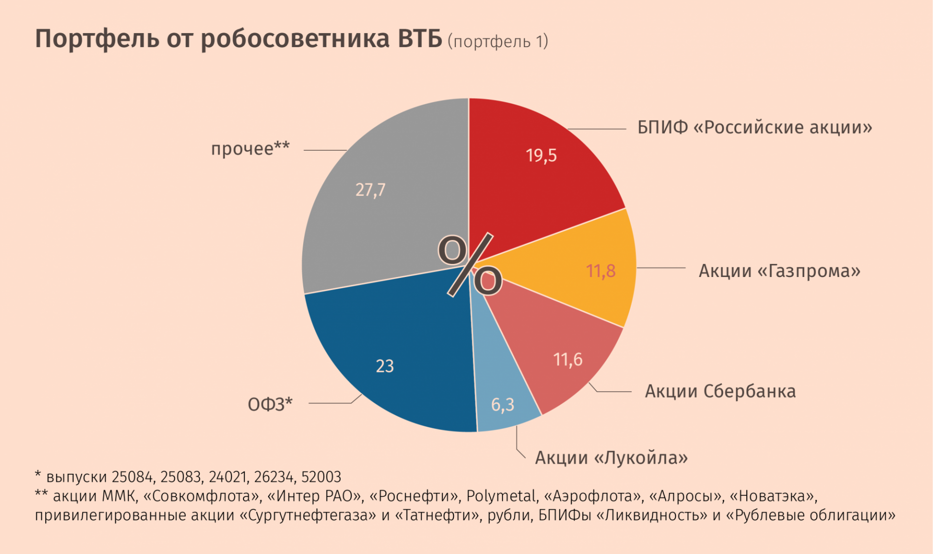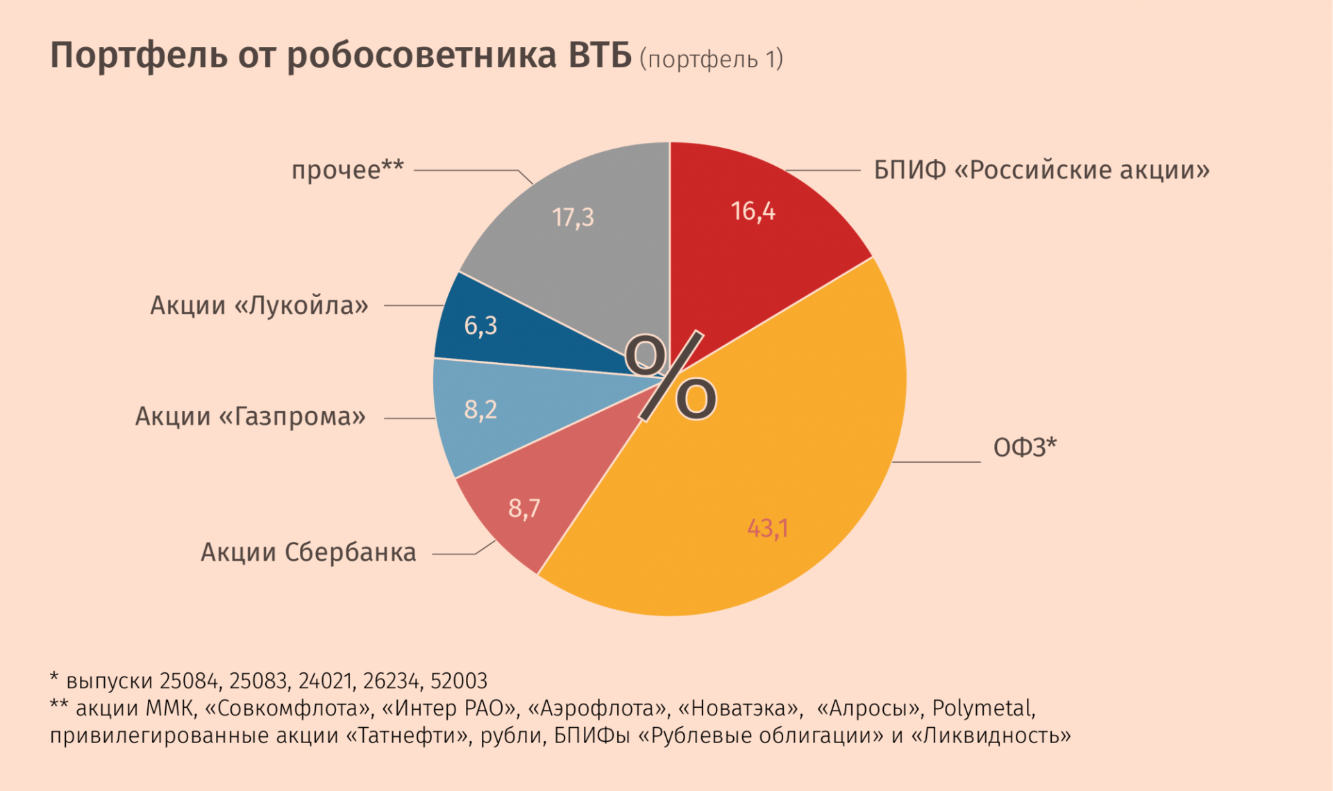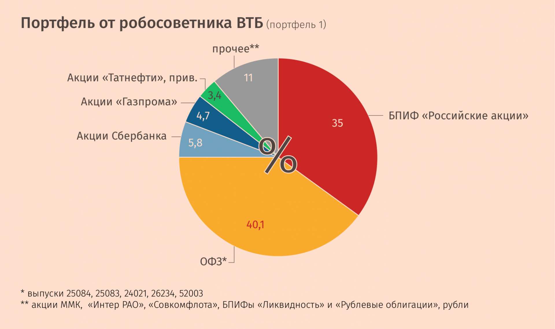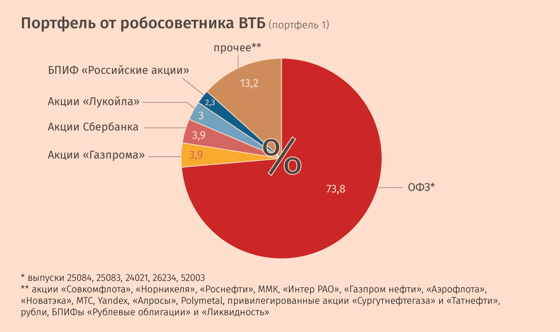 Всего робосоветник ведет шесть видов портфелей: от ультраконсервативного, который состоит только из облигаций, до ультраагрессивного, только из акций. Два или три из них он и предлагает инвестору на выбор после опроса. Согласно информации на сайте брокера, портфели формируются управляющими ВТБ на основе списка примерно 25 наиболее ликвидных российских акций, ОФЗ и биржевых фондов (БПИФ) ВТБ. Поэтому по составу портфели всех наших инвесторов оказались похожими, даже выпуски ОФЗ рекомендованы одни и те же. Но в зависимости от бюджета и профиля инвестора менялось количество бумаг в портфеле и соотношение разных классов активов. Например, у инвестора 2, которая копит на пенсию, 65% портфеля было рекомендовано разместить в различные ОФЗ. А у героини 4, которая задумана как агрессивный инвестор, практически весь портфель состоит из акций российских голубых фишек и БПИФа на акции.