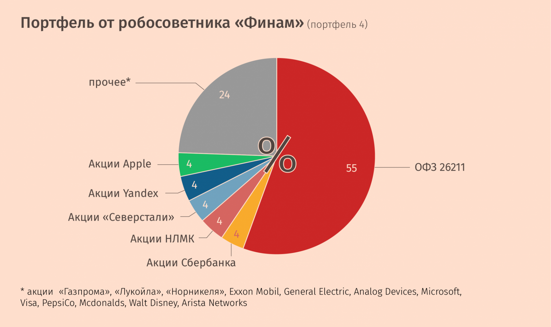 Портфель № 4 — тоже сборная солянка из акций и ОФЗ на 55%, причем гособлигации с погашением через два года.