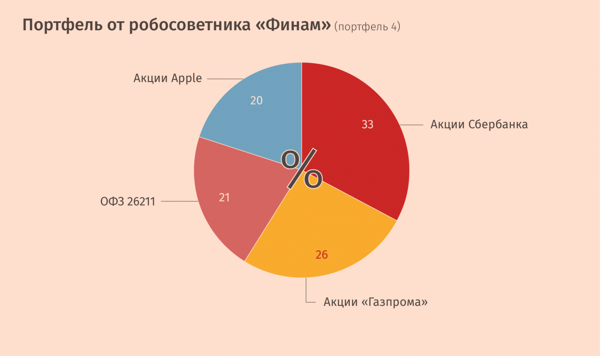 Робот анализирует исключительно ликвидные инструменты из S&P100 и топ-20 из индекса Мосбиржи, уточнил представитель «Финама». Портфель, по его словам, подбирается для каждого клиента индивидуально. В некоторых случаях портфель может состоять из одинаковых инструментов, но в разных пропорциях для разных риск-профилей.