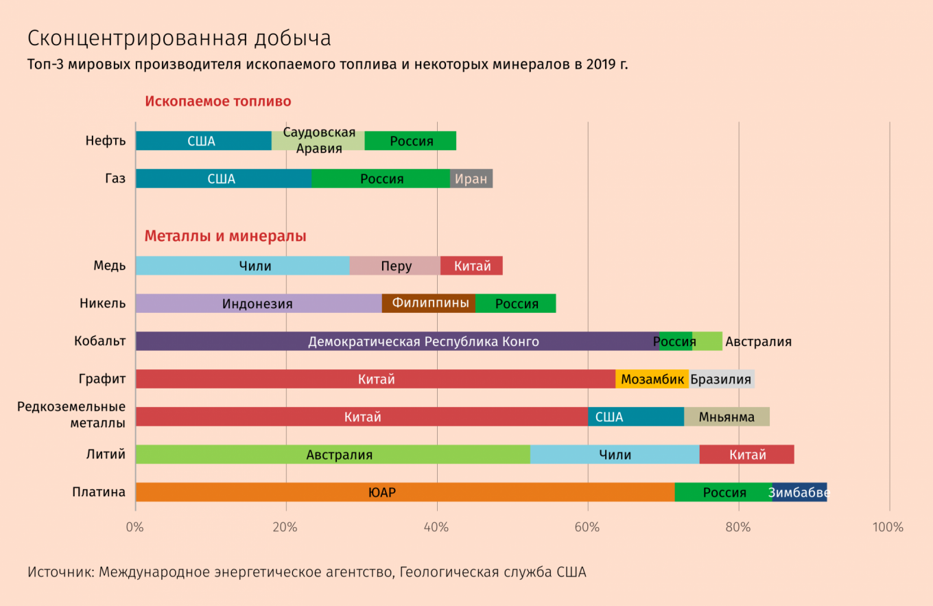 Нефть в последнее столетие была стратегическим ресурсом и даже своеобразным оружием благодаря неравномерному распределению запасов и их концентрации в определенных регионах. С металлами для чистой энергетики ситуация порой обстоит еще хуже, так как концентрация их производства выше, указывает МЭА. Так, более 60% кобальта добывается в Демократической Республике Конго, а 65% перерабатывается в Китае.