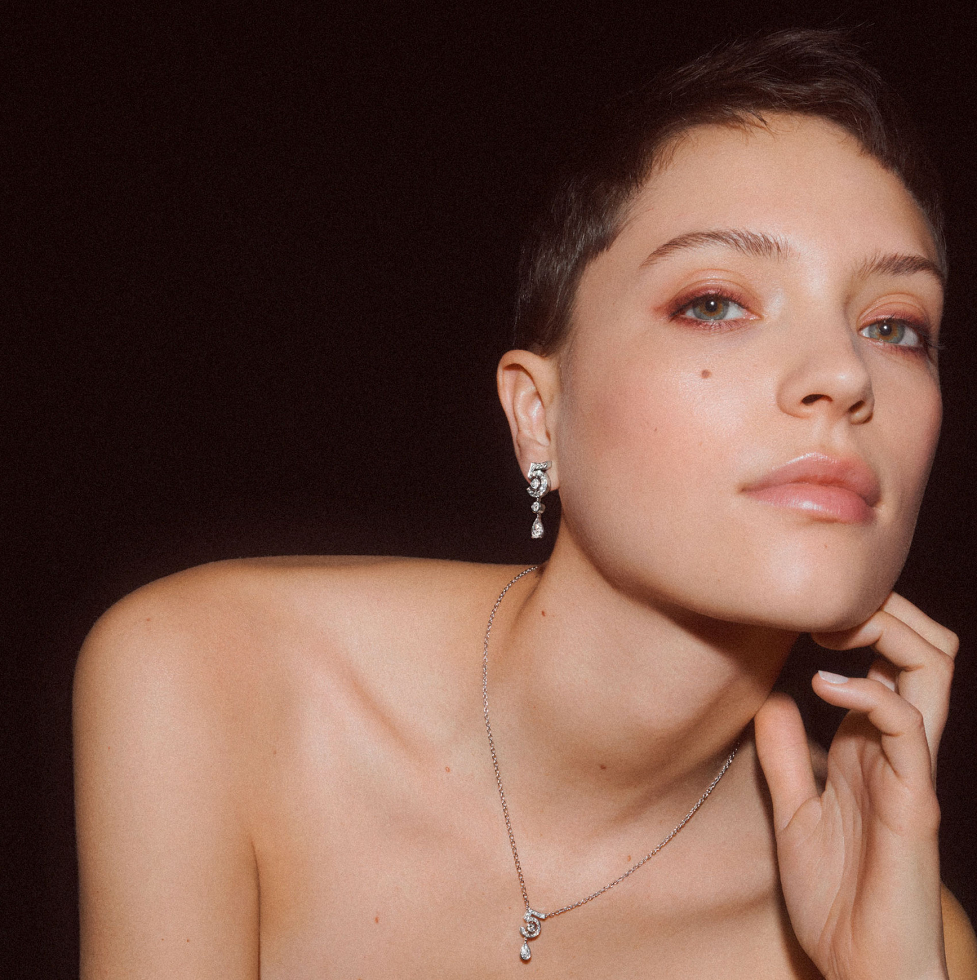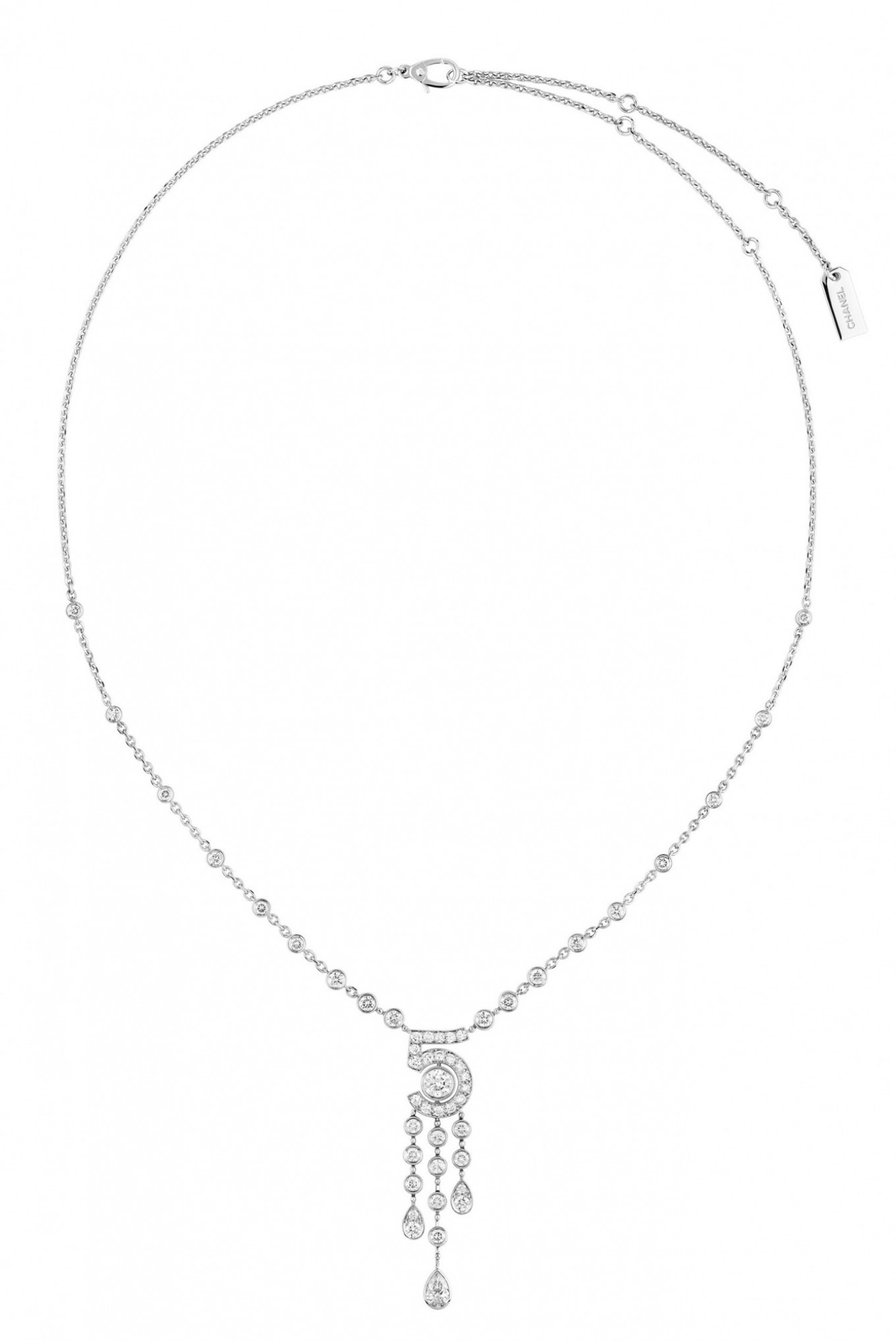 Коллекция высокого ювелирного искусства Collection №5 началась с уникального колье «55.55» — украшения в форме флакона Chanel №5 с центральным бриллиантом весом 55,55 карата. Колье изготовлено в единственном экземпляре и не будет поступать в продажу, оно станет частью музейной истории дома Chanel.