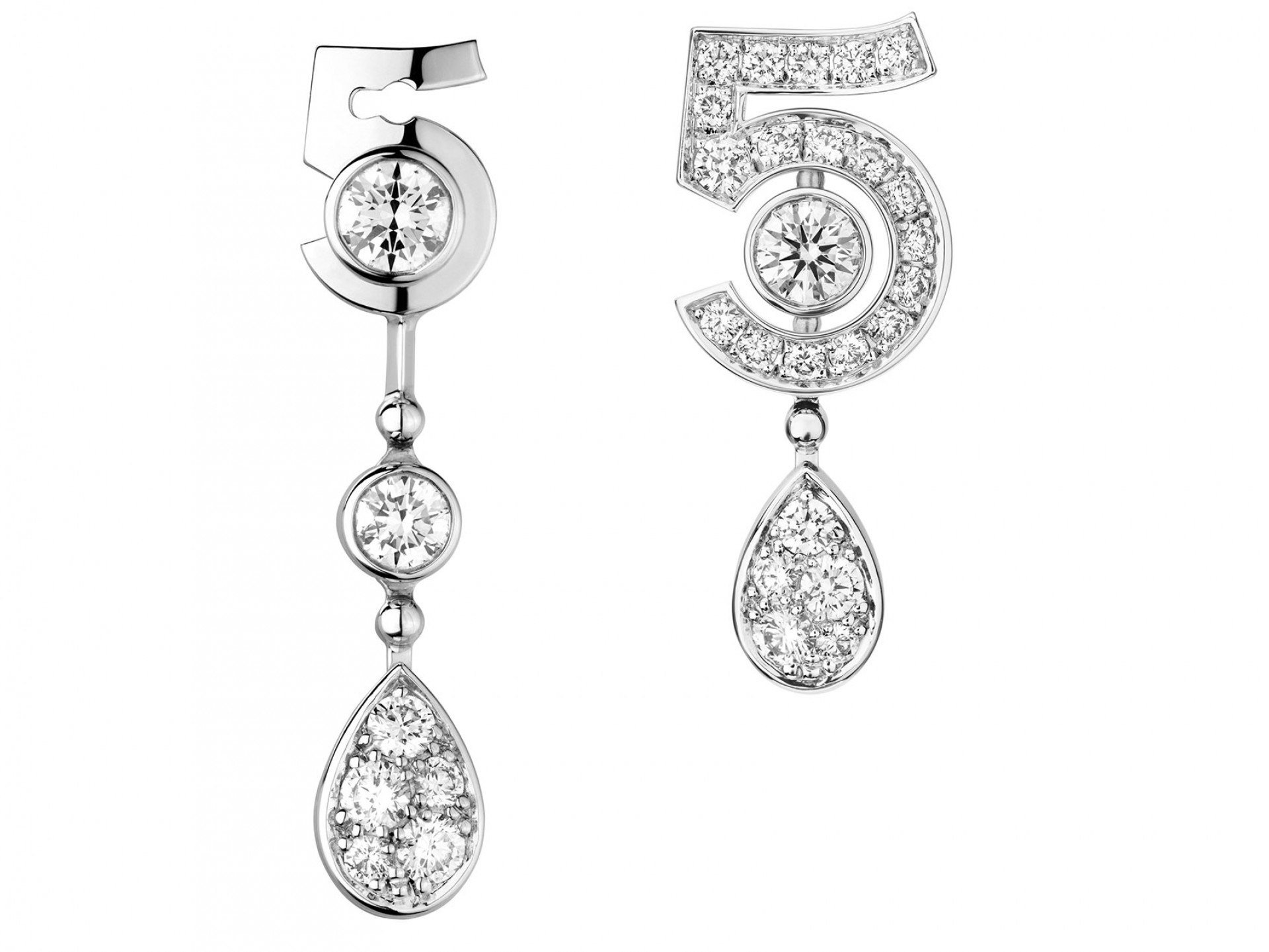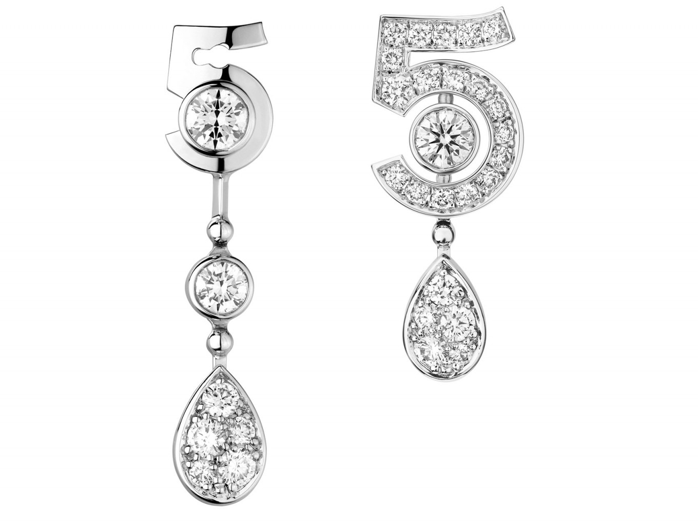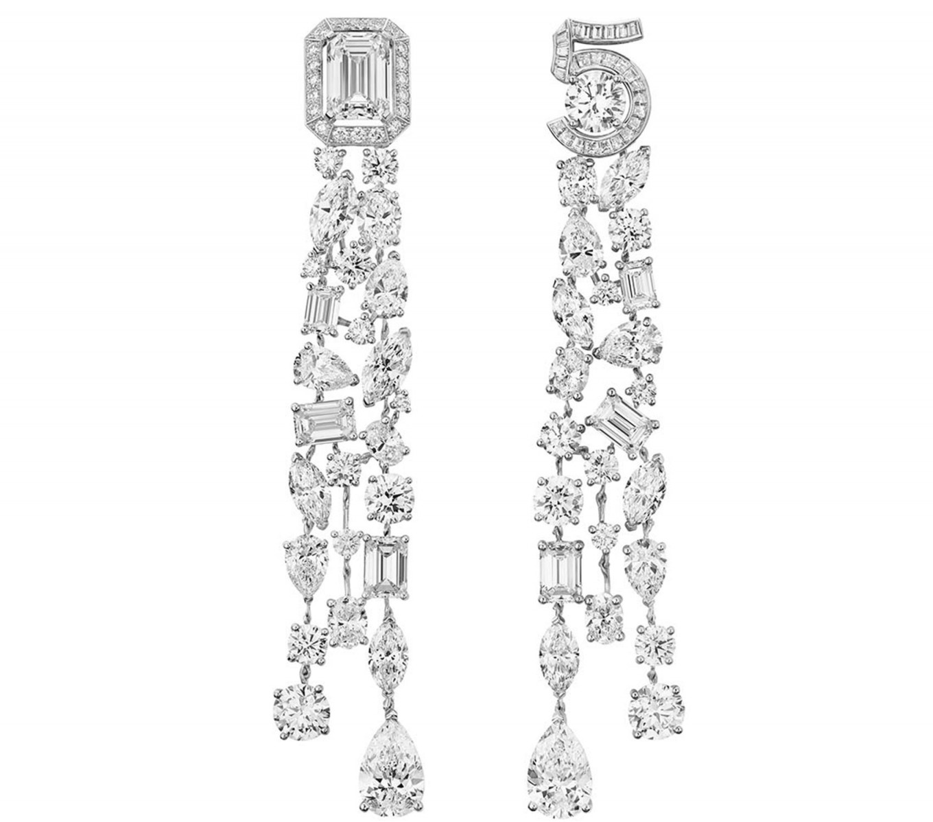 Дизайн украшений в коллекции №5 выстроен вокруг цифры пять. Это не только название юбилейного аромата, но и любимая цифра основательницы Chanel, Габриэль Шанель. Все украшения выполнены из 18-каратного белого золота и декорированы бриллиантами — так же, как была сделана первая и единственная коллекция ювелирных украшений Bijoux de Diamants, созданная самой Шанель. Сейчас выпущены четыре украшения: колье, серьги, подвеска и кольцо. Большинство украшений — трансформеры: колье можно носить в коротком и длинном вариантах, а серьги разной формы — вместе или по отдельности. №5 станет постоянной коллекцией и будет пополняться новыми украшениями. №5 будет представлена в продаже в бутиках Chanel по всему миру, ориентировочная цена — от 680 000 руб. за кольцо до 3,5 млн руб. за колье.