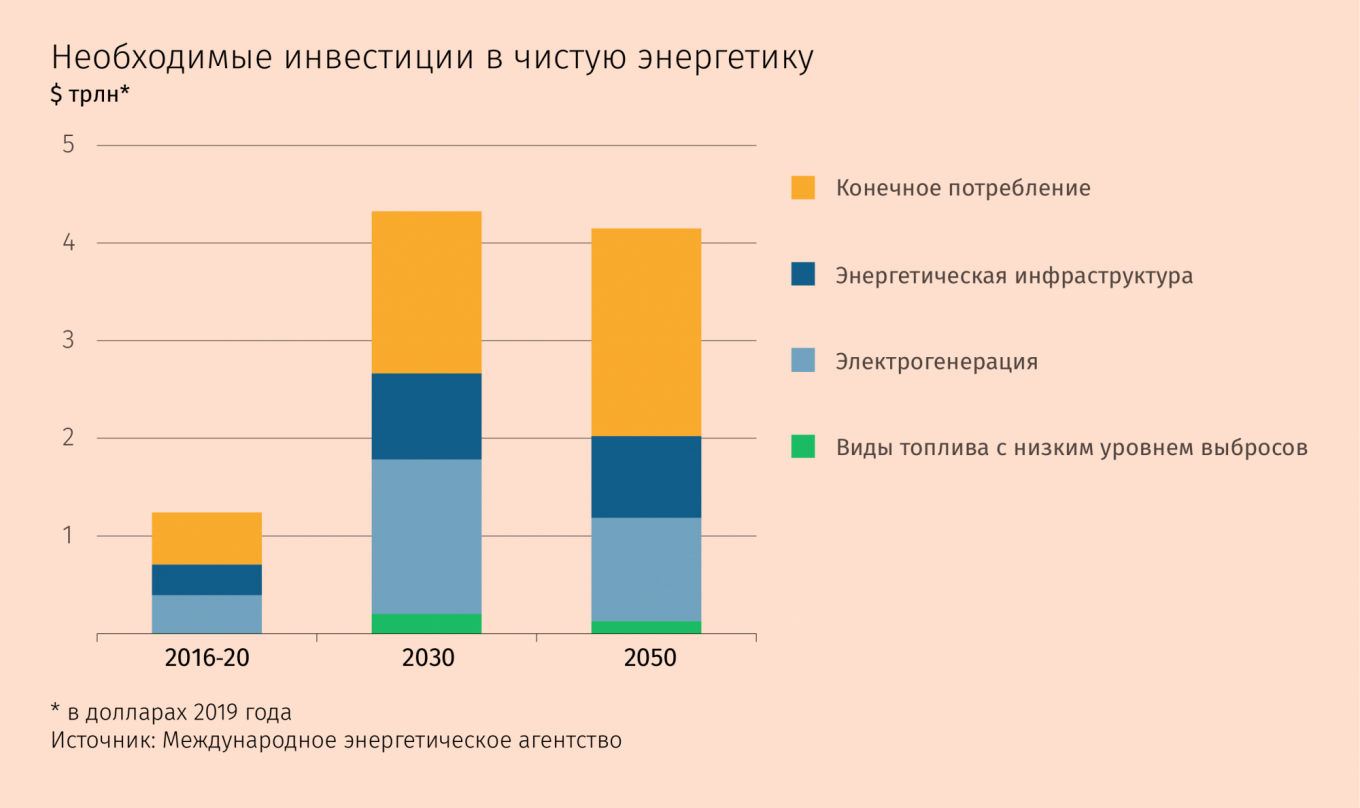 Для достижения этой цели придется не только радикально сократить потребление ископаемого топлива, но и увеличить расходы на чистые и низкоуглеродные технологии, причем в беспрецедентных масштабах, говорится в докладе. Потребность в таких инвестициях, по оценке МЭА, составляет около $5 трлн в год до 2030 г. против $2 трлн сейчас.