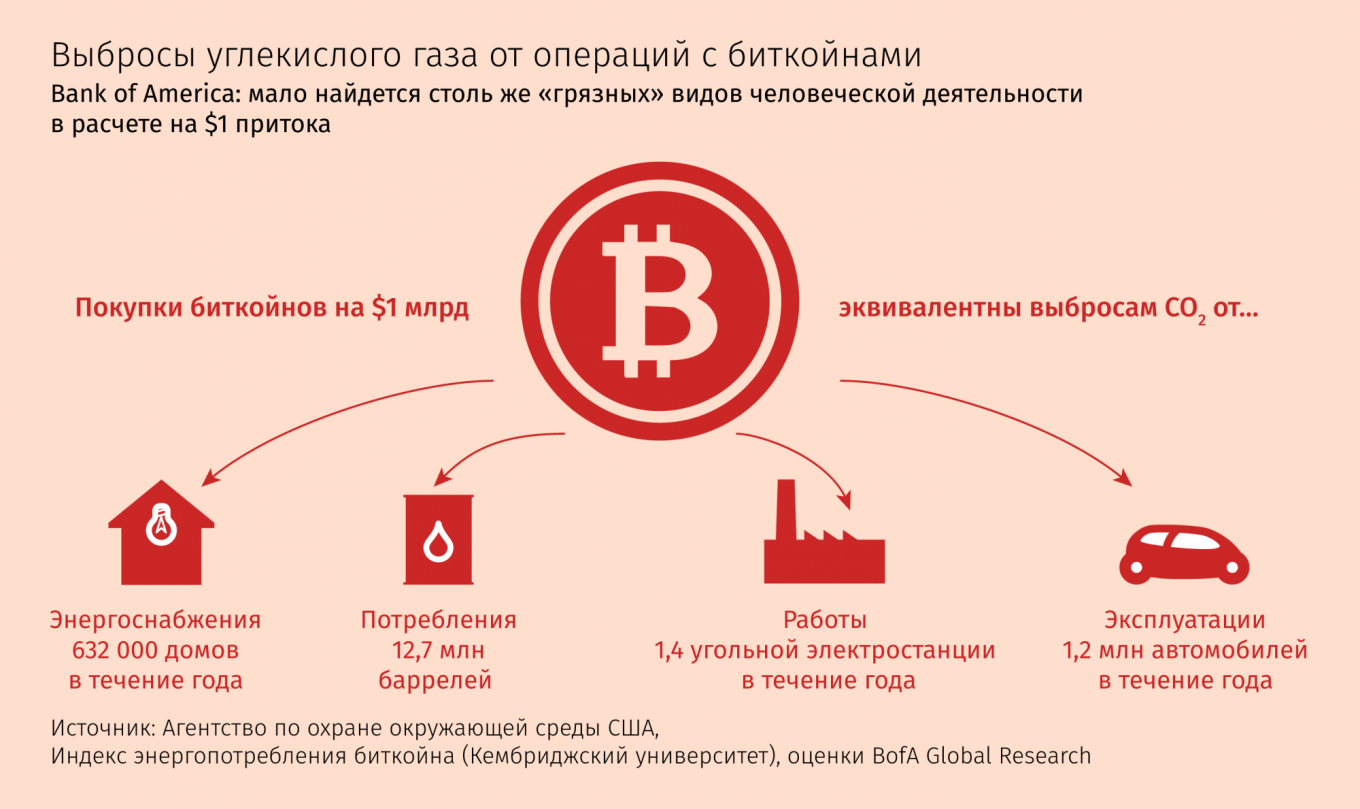 К тому же в последнее время даже сторонники биткойна стали обращать больше внимания на его слишком жирный углеродный след. Для производства виртуальной валюты и операций с ней требуется огромное количество электричества, которое к тому же во многом вырабатывается на угольных электростанциях Китая (где сосредоточены основные мощности для майнинга). В мире, который стремится свести нетто-выбросы углекислого газа к нулю и где изменением климата больше всего озабочены миллениалы (которые одновременно сильно увлекаются криптовалютами), это большой минус.