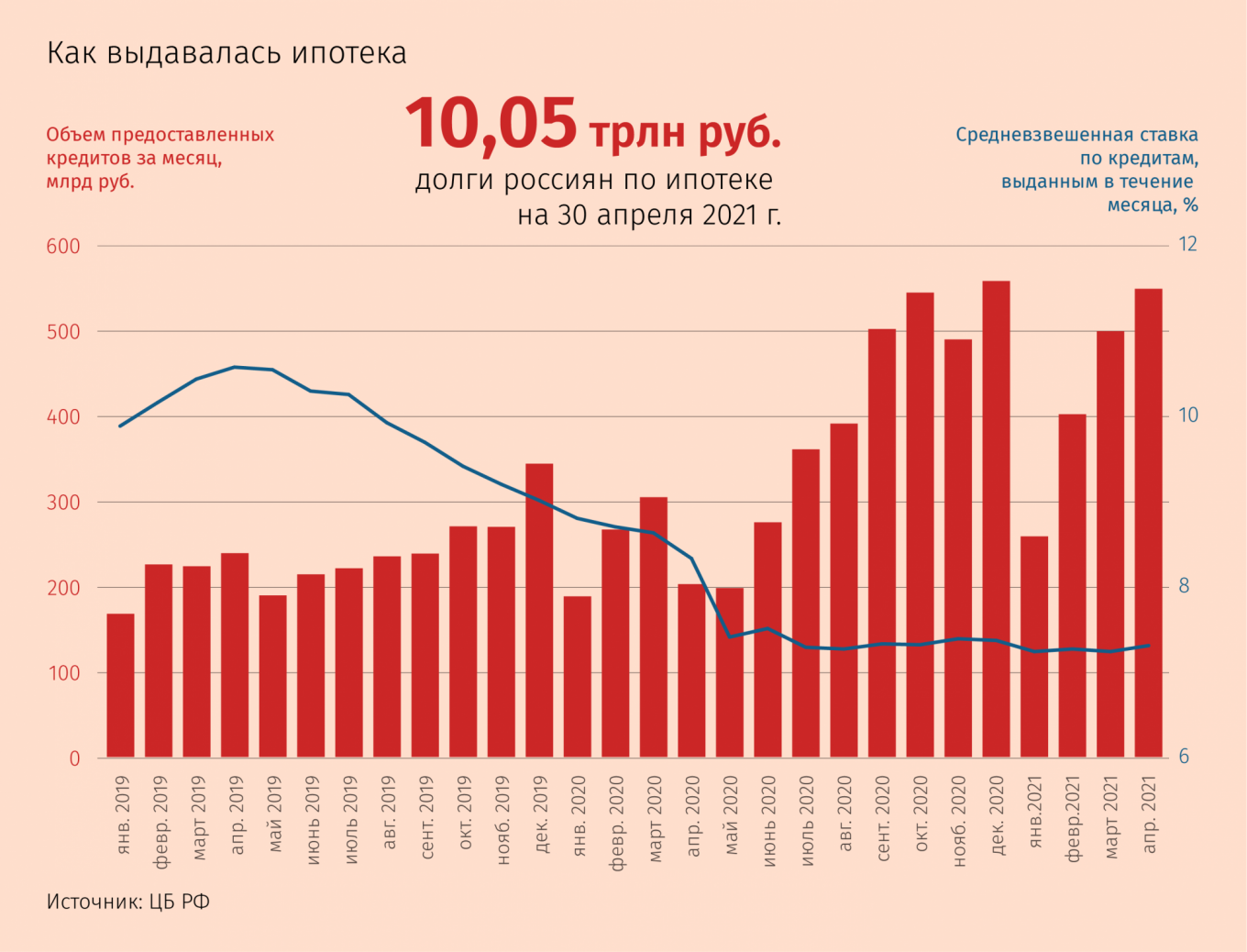 Ипотека в России набирает обороты. Выдачи жилищных кредитов в апреле приблизились к рекордным значениям конца прошлого года. За месяц россияне оформили почти 191 500 кредитов на 551 млрд руб. — всего на 2% меньше, чем в рекордном декабре, следует из статистики ЦБ. В результате общая задолженность по рублевой ипотеке к 1 мая превысила 10,05 трлн руб.