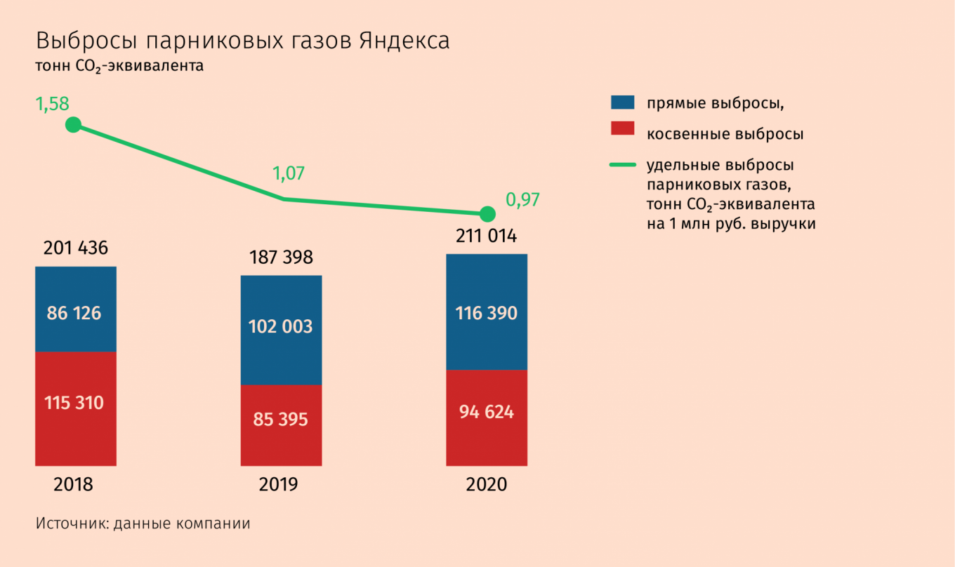 Компания анализирует и свой углеродный след. В 2020 г. «Яндекс» впервые провел оценку прямых и косвенных энергетических выбросов парниковых газов. Прямые для «Яндекса» — это автомобили в собственности и лизинге, автономные генераторы энергии, холодильное оборудование. Например, сжигание топлива автомобилями в собственности и лизинге (беспилотники и каршеринг «Яндекс.Драйв») составило 44% выбросов парниковых газов. Косвенные — это парниковые газы, образованные за счет потребления тепловой и электрической энергии, которую компания не выработала самостоятельно, а закупила у третьих сторон, например у сетевых компаний. За базу для расчетов «Яндекс» брал 2018 г. В 2020 г. прямые выбросы увеличились на 11%, косвенные — на 14%, указывает «Яндекс», а совокупные — на 12%, «что коррелирует с ростом бизнеса».